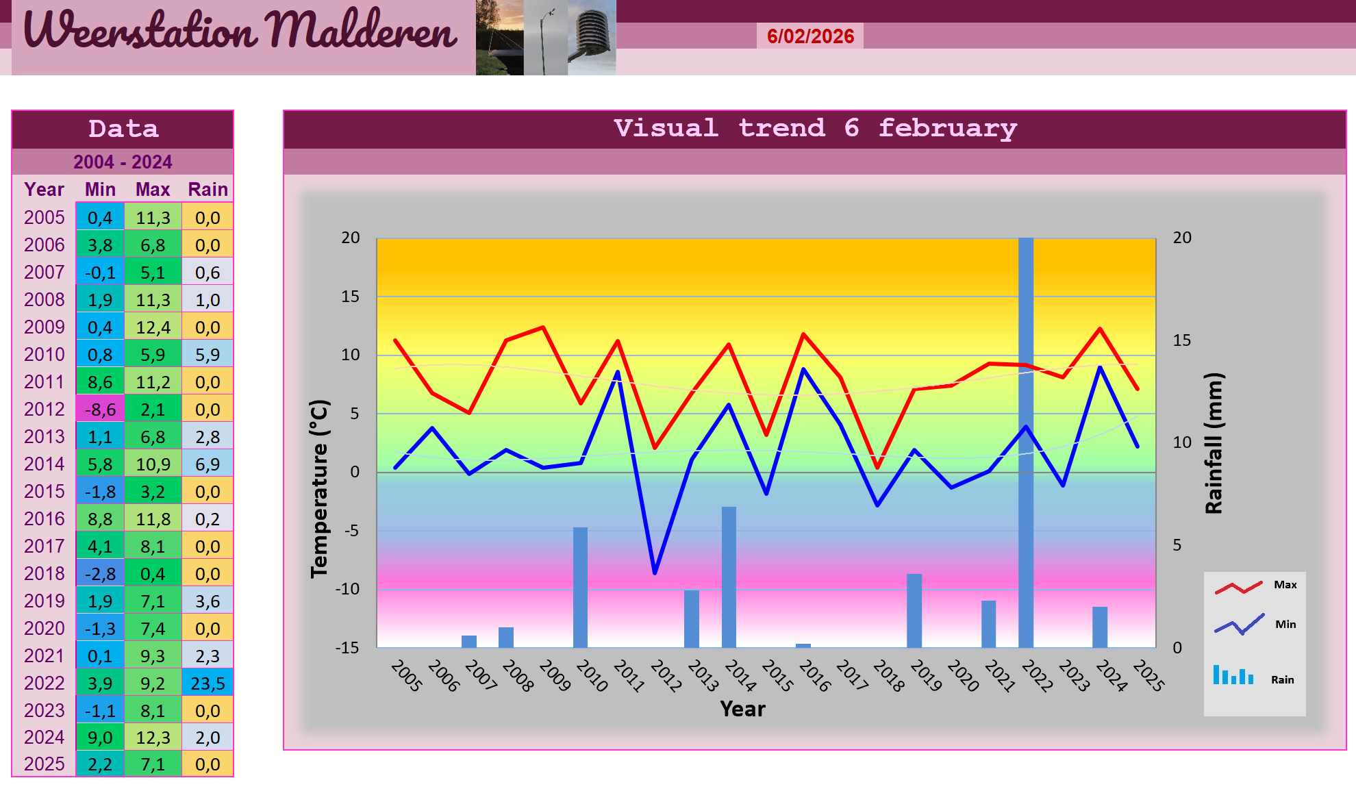 De regenzone is tijdens de nacht langzaam dichterbij gekomen en de bewolking bestond uit Altostratus, Altocumulus en Stratus fractus welke in warme kleuren oplichtten dankzij de opklaringen die er nog hingen in het zuidoosten. Kouder dan 1,9 graden is het niet meer geworden en door de opkomende bewolking bleef de temperatuur na zonsopgang constant. Het duurde niet lang voor de eerste neerslagmeldingen binnen kwamen, doch de band met intensieve regen bleef min of meer ter plaatse trappelen in het westen en in Malderen bleef het gewoon droog. Het enige dat we hier konden waarnemen was een vrij krachtige zuidwestenwind en het was al bijna donker toen het ook in Malderen begon te druppelen. Samen met deze neerslag bereikte ook het grondwarmtefront ons waardoor we de temperatuur nu zagen stijgen naar 7,1 graden nadat deze de hele dag min of meer constant bleef. De neerslag werd ondertussen weer lichter, voor zover deze al iets heeft voorgesteld. We kwamen uit op een teleurstellend dagtotaal van 3,6 mm.