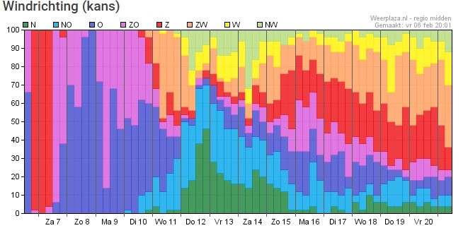 De wind krijgt later een meer en meer noordcomponent.