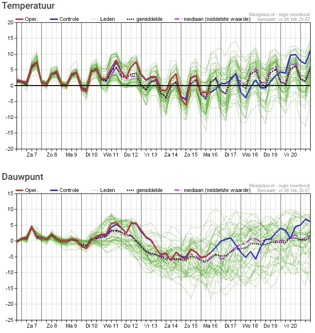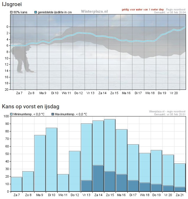 Een aantal dagen laat 20 tot 30% kans op ijsdagen zien rond het midden van de maand. En 80% kans nog steeds op ijs van 8 tot 10 cm.
