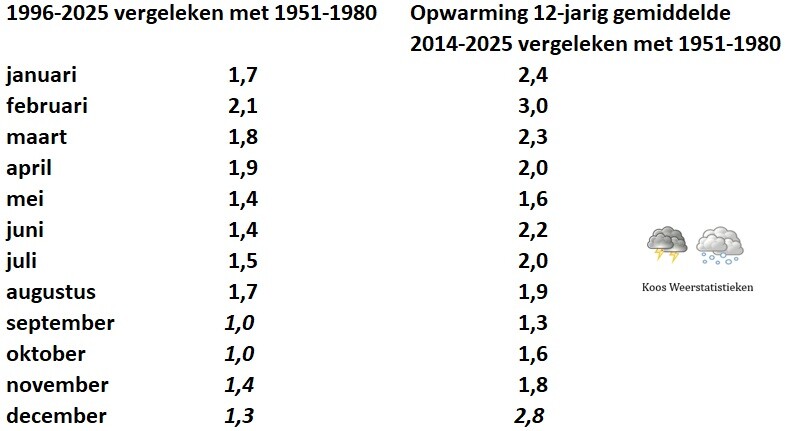 Wanneer je bijvoorbeeld het 12-jarig gemiddelde neemt van februari dan is deze maand vergeleken met het klimaatgemiddelde van 1951-1980 maar liefst 3,0 °C opgewarmd.