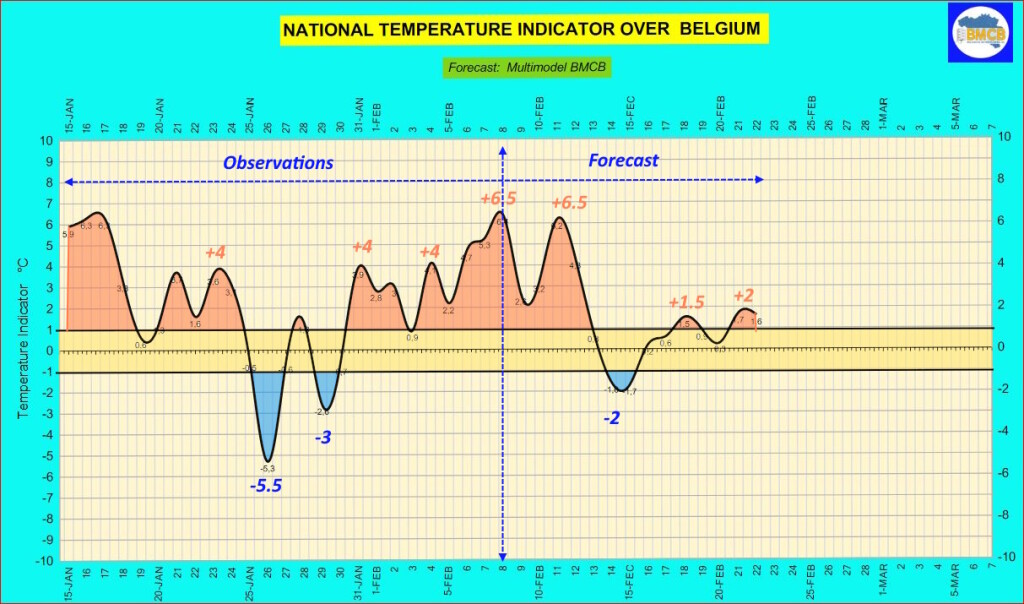 Tot en met 12 februari zal de Belgische nationale thermische index schommelen tussen +2 en +7. Dit resulteert in maximumtemperaturen van 7 tot 13 °C, lokaal zelfs 14 °C op deze zondag en opnieuw op woensdag. Op de overige dagen blijven de maxima doorgaans beperkter, meestal tussen 5 en 11 °C.