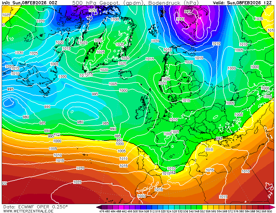 Je zou het niet zeggen met zo'n zuidelijke straalstroom en een hoog boven Scandinavië, maar op de 2e kaart is de scheiding tussen kou en warmte uit het zuiden goed te zien.