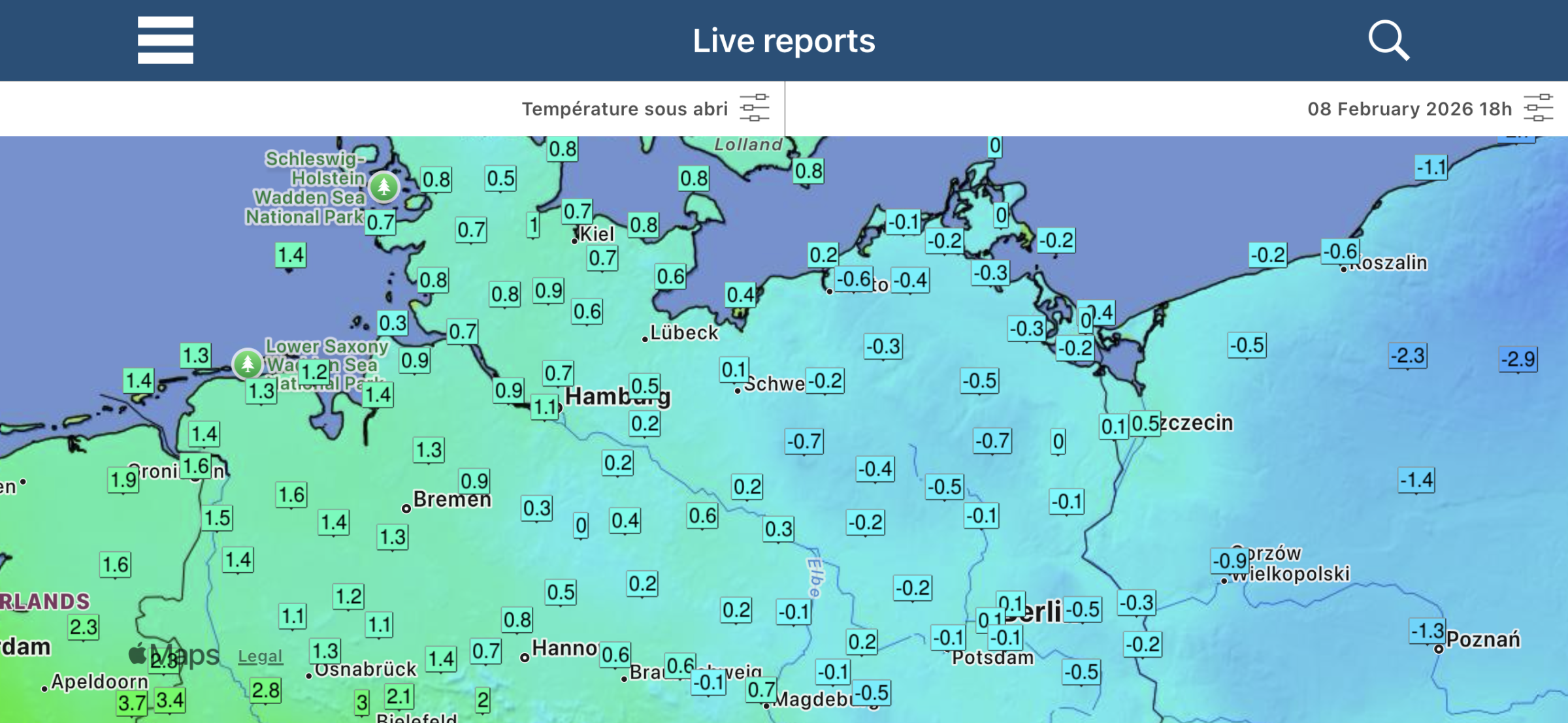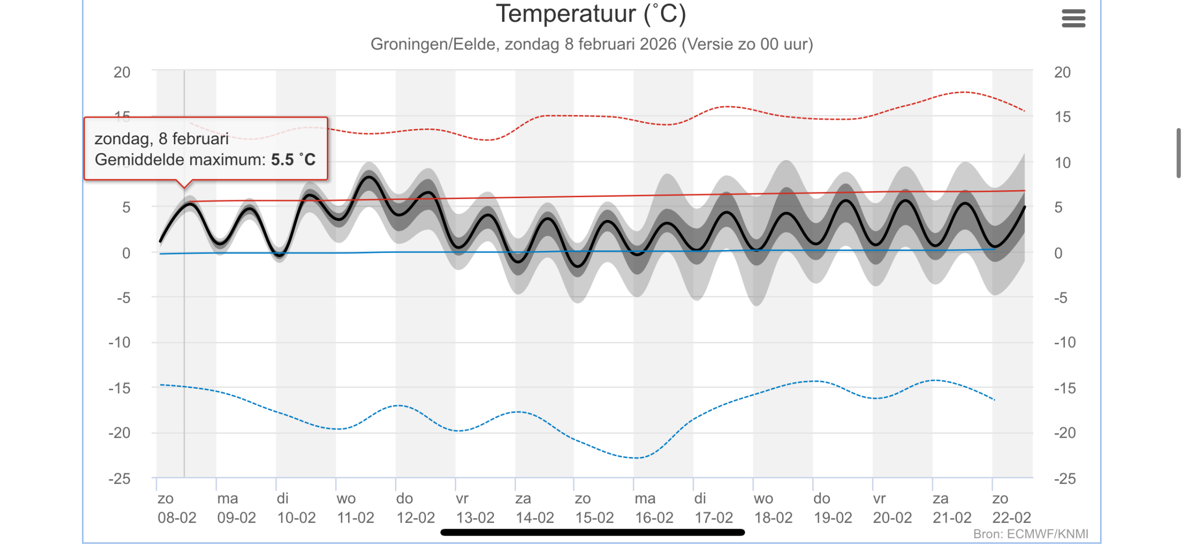 Zie pluim. Het zou 5,5 graden worden, misschien nog wel ietsje hoger. We zijn in werkelijkheid dat we hier nog altijd aanvoer hebben vanuit het Noord-Duitse laag land. We hebben vergelijkbare temperaturen. Feitelijk is de situatie nog steeds zoals al weken, alleen met iets hogere temps. Ik heb zelf een Tx gemeten vandaag van 2,3, waarbij de temp de gehele middag aan het delen was. Tact 1,4. Met het draaien van de stroming naar ZO zou er mogen wat drogere lucht moeten komen, maar goed we zien al dagen dat zulks niet niet. Dit komt vaak door onvoldoende windkracht en daardoor ook onvoldoende menging. De lucht blijft haar eigen karakter houden, al is er door de vele depressies en aanvallen op de kou en stromingsrichting wel een verandering opgetreden in temp en vochtigheid. Meer vocht en hogere temps. Eens zien wat er morgen van komt.