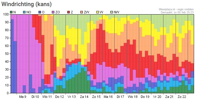 De wind verlaat na dinsdag de zuidoosthoek. Vanaf dan zal de windrichting behoorlijk variëren al naar gelang hoe de storingen ons gaan passeren.