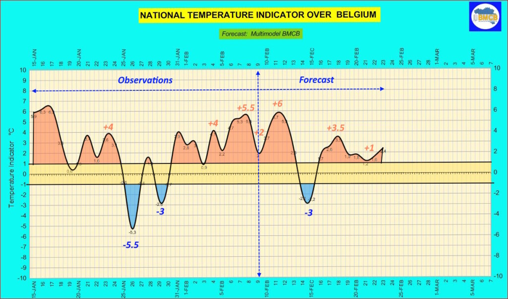 Vanaf 16 februari en minstens tot 23 februari zou opnieuw een zachtere fase volgen. De nationale thermische index stijgt dan naar waarden tussen +1 en +4. Overdag worden temperaturen van 5 tot 12 °C verwacht op de zachtste dagen en 3 tot 10 °C tijdens koelere perioden.