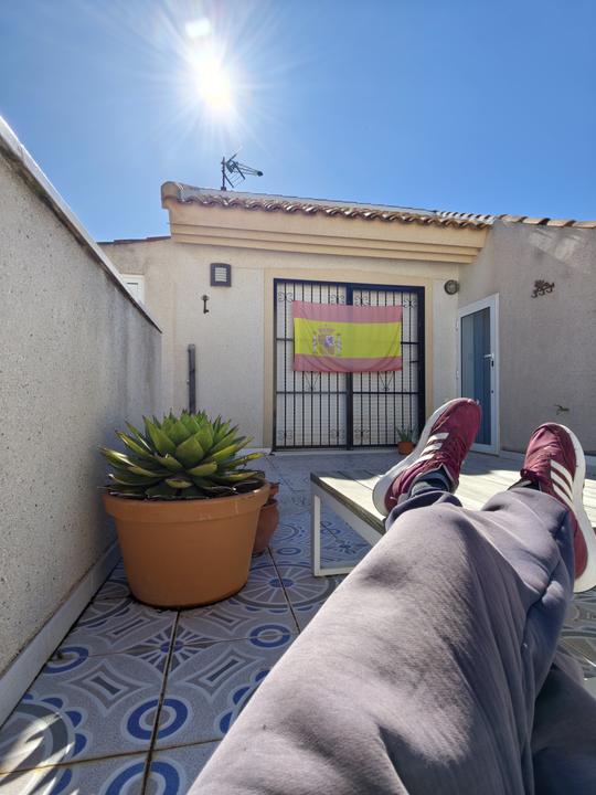 Nu in t-shirt genietend van mijn lunchpauze op het dakterras van ons tijdelijke verblijf (zitten in verhuisfase)