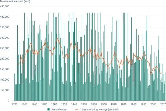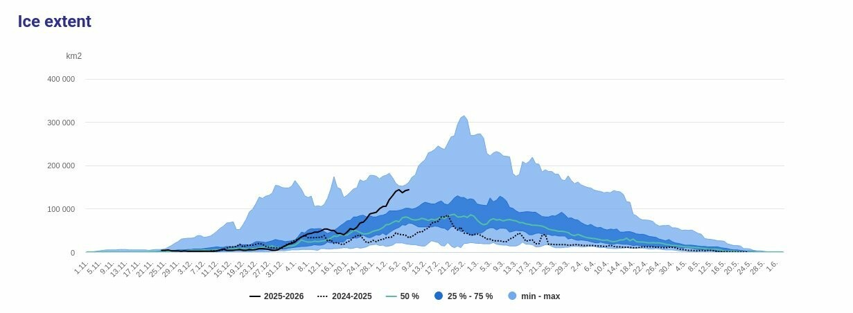 Een stukje uit het Poolse bericht : Na 2007 (zie grafiek) bereikte de ijsbedekking van de Oostzee zelfs een grotere omvang rond de overgang van december naar januari. Op 2 februari 2010 bereikte de ijsbedekking 180.000 km². Op 4 januari 2011 was dat 165.000 km². De maximale ijsbedekking overschreed de 300.000 km². Als we teruggaan naar de jaren 1985-1987, zien we dat de ijsbedekking bijna 100% van het totale oppervlak bedekte.