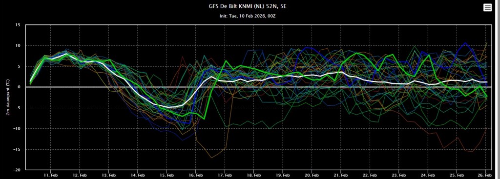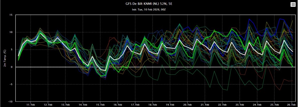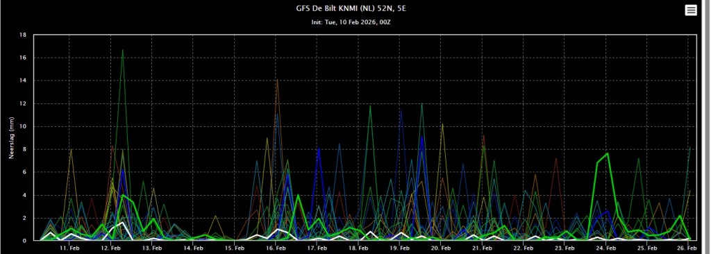 De wisselvalligheid komt er flink in. We zitten rondom in de lagedrukgebieden. Soms komen we even in wat koudere lucht wanneer een depressie zorgt voor wat noordelijkere aanvoer van maritiem polaire lucht. Zoals aankomend weekend. Maar echt winterweer zit er volgens GFS voorlopig niet aan.