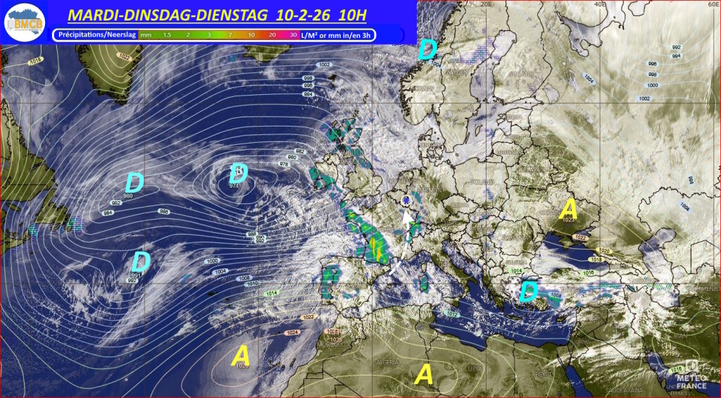 In samenhang met een andere depressie van ongeveer 973 hPa ten noordwesten van Schotland, bereikt in de nacht van zondag op maandag een nieuwe storing onze regio's vanuit het westen, met regen, lokaal voorafgegaan door natte sneeuw of sneeuw.