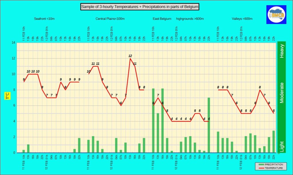 Rond 10°C aan zee, 9–12°C in het binnenland, 7–8°C in de Hoge Ardennen.