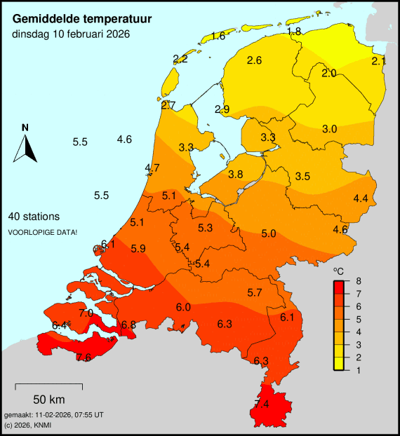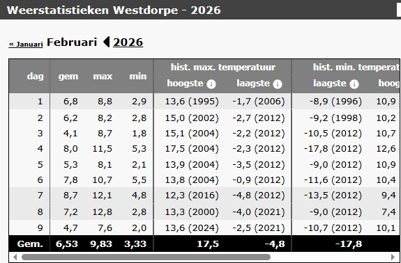 En die waarde is gisteren zelfs iets gestegen, want de 10e kende in Westdorpe een gemiddelde temperatuur van 7,6C. Daarmee komt het uit op gemiddeld 6,64C (zonder afronden op één decimaal).