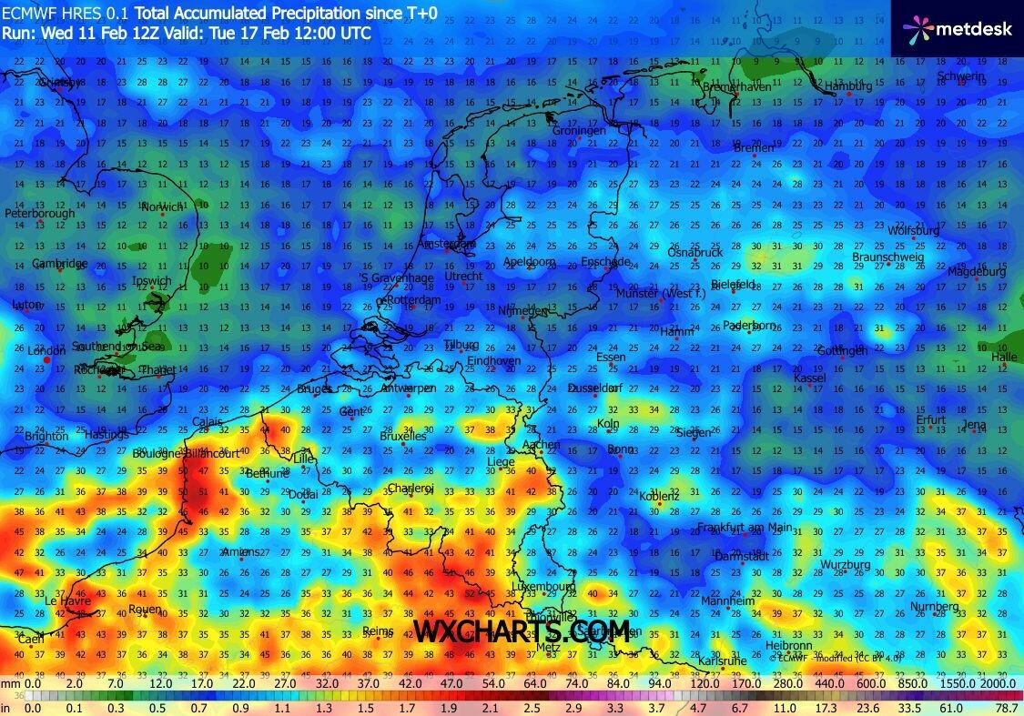 Stuk minder neerslag en ook van die sneeuw op zondag (en eventueel vrijdag) blijft zo goed als niets meer over. Nu nog 20-30mm tot dinsdag ipv die 50mm. Ook vandaag minder neerslag gevallen