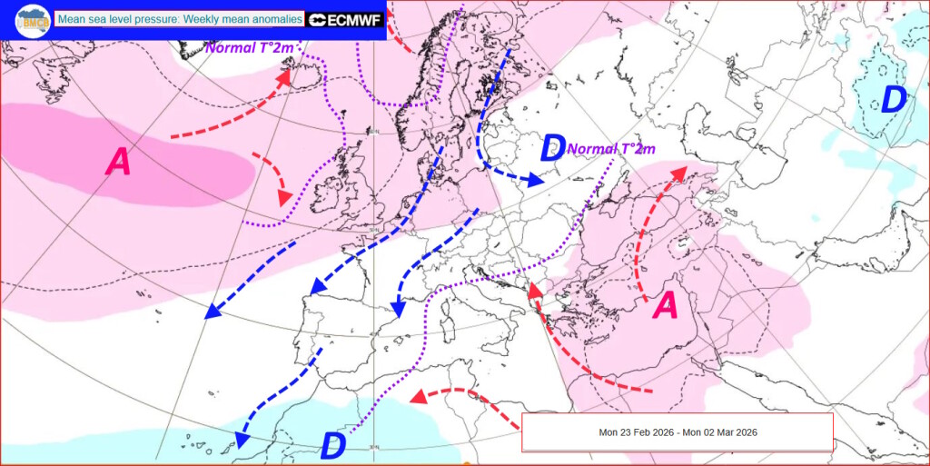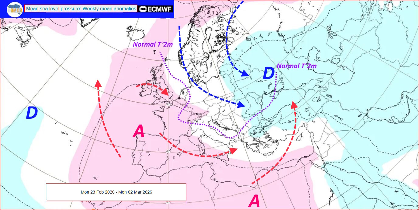 Het laatste deel van februari en de eerste dagen van maart zouden worden gekenmerkt door de ontwikkeling van een uitgestrekt hogedrukgebied dat zich uitstrekt van de Noorse Zee tot Ierland, het Iberisch Schiereiland en zelfs tot de Sahara. Tegelijkertijd zouden lagedrukgebieden zich voornamelijk boven het oosten van het Europese continent verplaatsen.