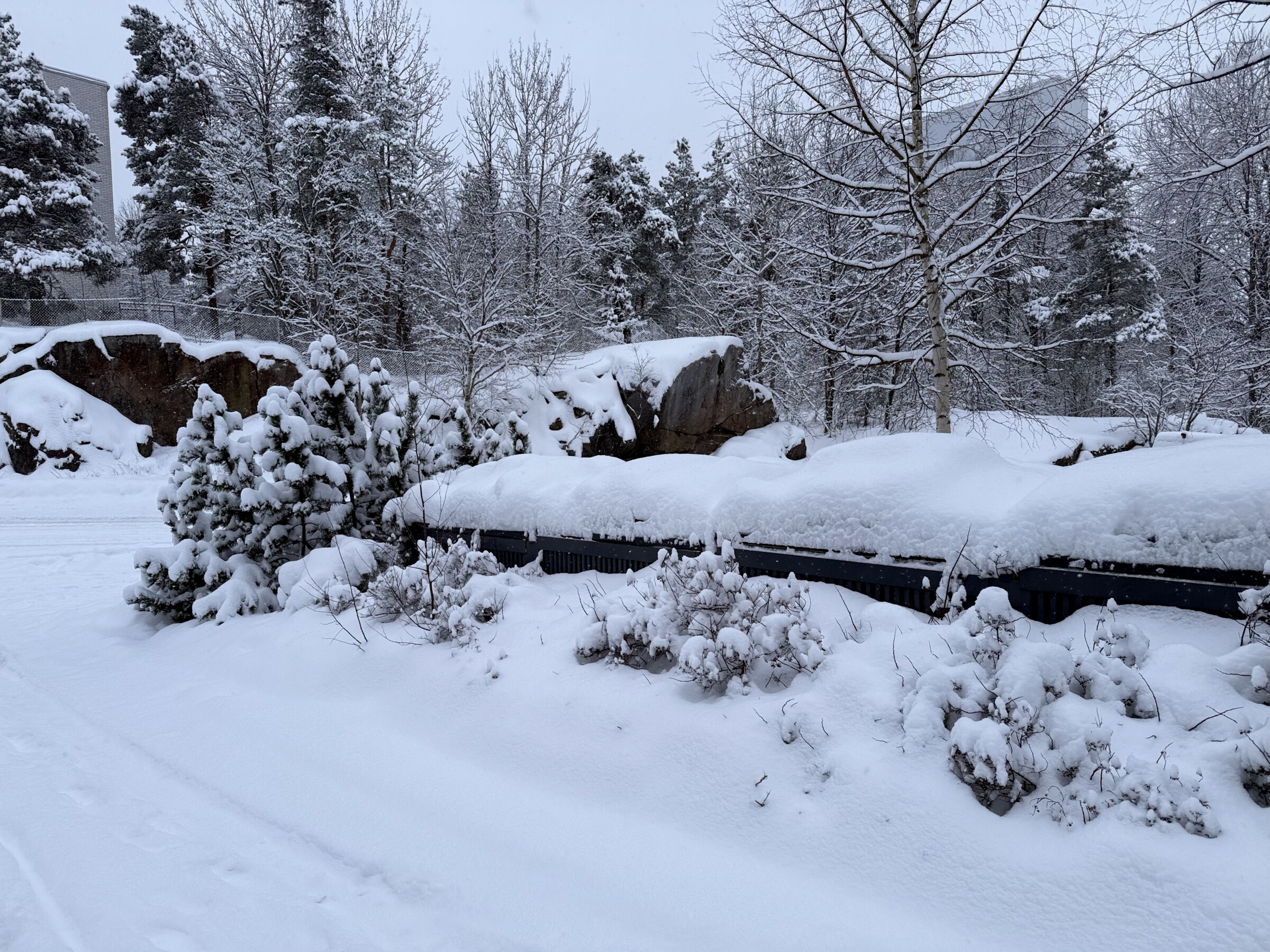 Weinig is mooier dan je gordijnen in de ochtend opendoen en zien dat er een dik pak sneeuw is gevallen! Sinds gisterochtend sneeuwt het hier bijna constant en vannacht ging het nog wat harder. Er is gemiddeld 13 cm sneeuw bij gekomen. Volgens de weerstations hier in de buurt ligt er nu in totaal zo’n 32 cm.