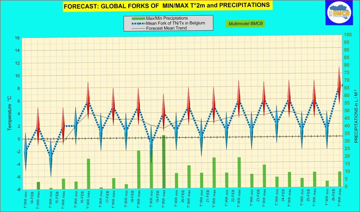 Zachter. Wisselend tot zwaar bewolkt met talrijke buien. Smeltende sneeuw boven 500–600 meter. Matige tot vrij krachtige westenwind met rukwinden van 35–55 km/u.