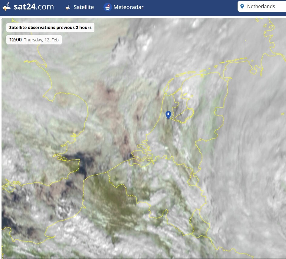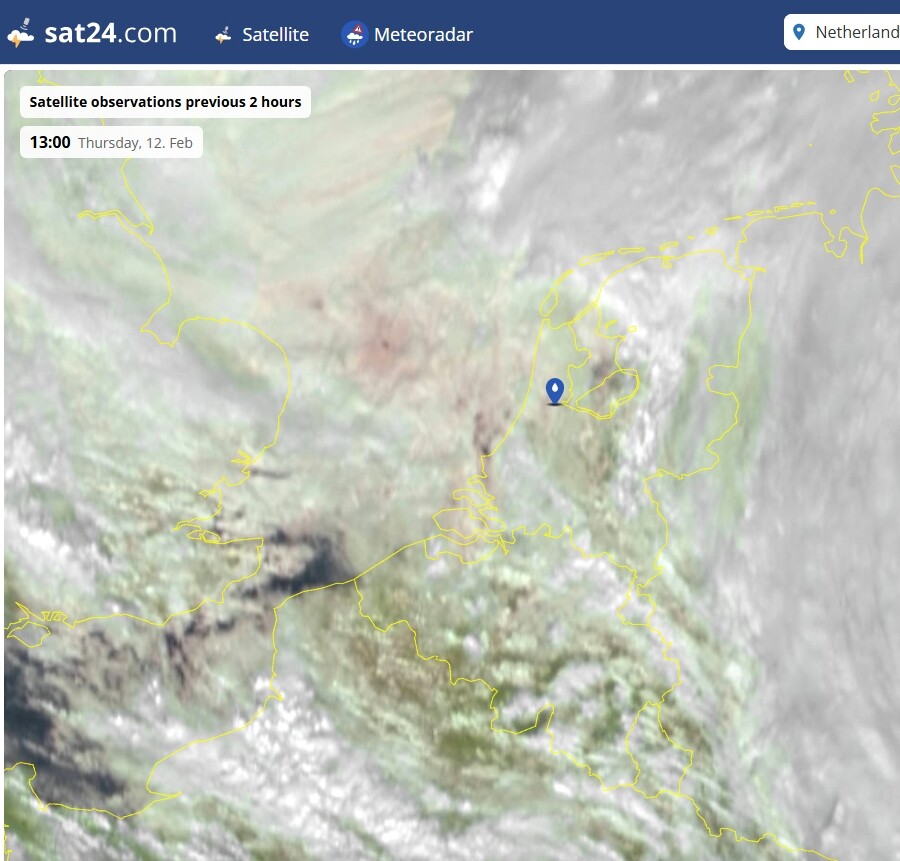 Tussen twee buienclusters door. Misschien daardoor in De Bilt, Cabauw en Herwijnen net iets warmer dan de rest van het midden?