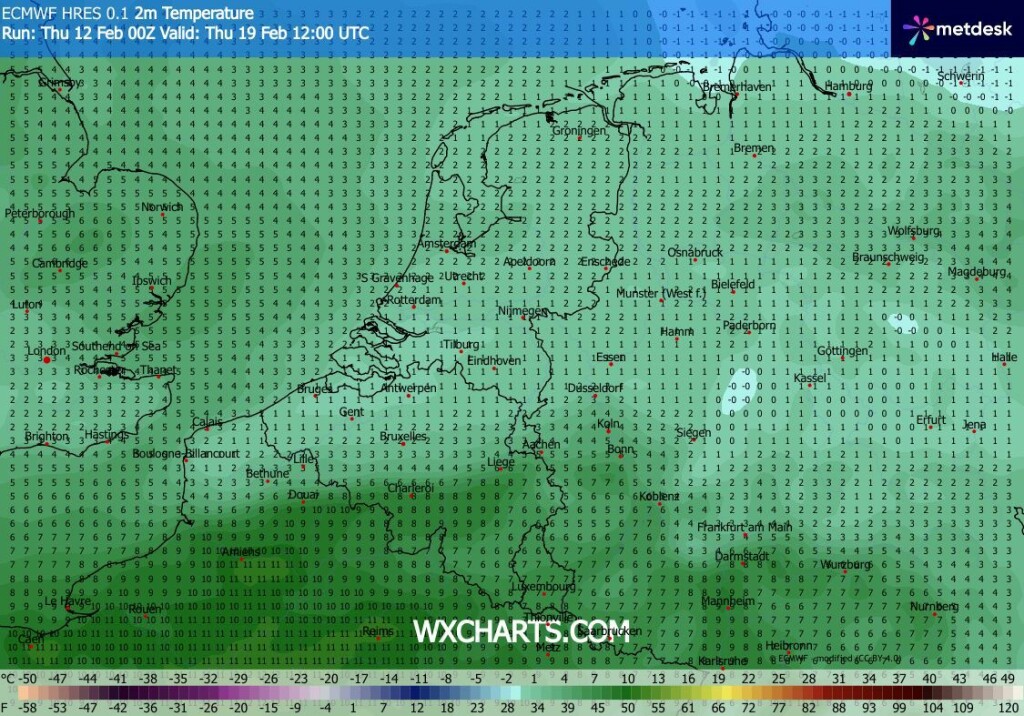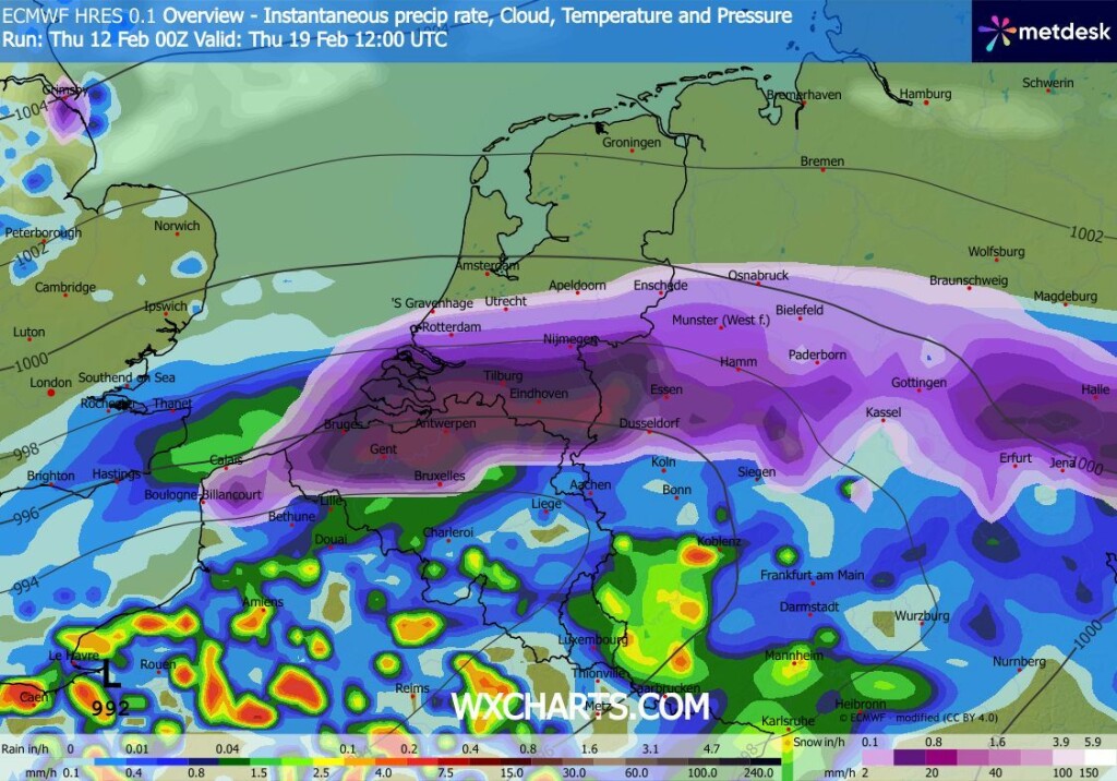 Bij EC namelijk sneeuw op donderdag 19 februari in de zuidelijke helft, terwijl GFS dan in de dubbele cijfers zit. Hieronder de bijbehorende kaarten (nou vooruit, op 180u is het)