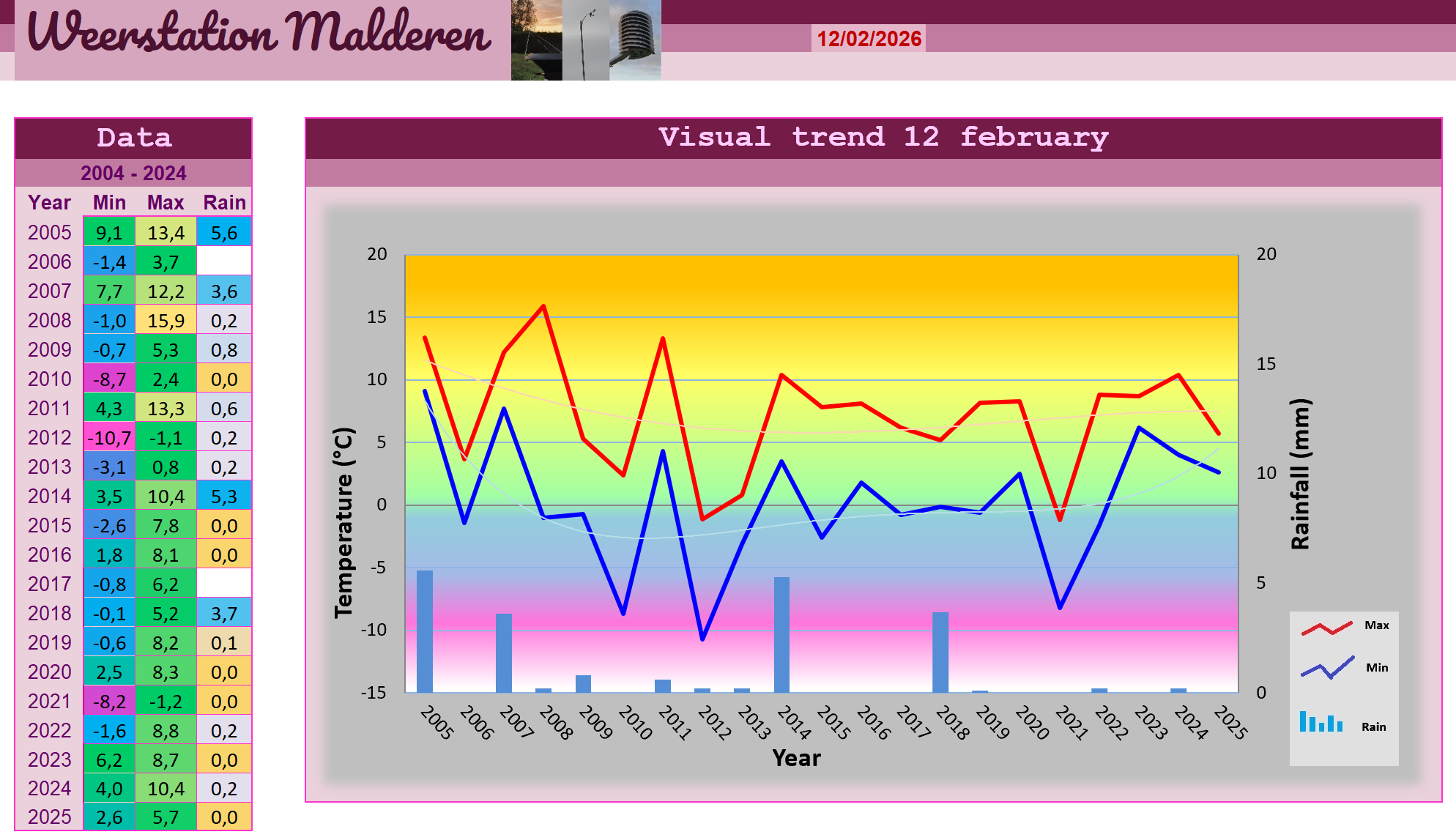 We bevonden ons vanochtend nog steeds netjes in de warme sector terwijl de regenzones van het koufront met een galante bocht rond België werden geslingerd. Dit zorgde voor temperaturen die op een aangenaam zachte 13,3 graden piekten terwijl het in het noordoosten van Nederland nog steeds ijzig koud was met zelfs een onderbroken sneeuwdekje van enkele millimeters aldus de meldingen die van daar binnensijpelden/dwarrelden. In de loop van de voormiddag kreeg het koufront echter ook Malderen in het vizier en ging de bewolking snel toenemen vanuit het westen. We konden nog een uurtje van de zon genieten alvorens het luchtruim werd ingenomen door Stratus en Stratus fractus terwijl de hogere luchtlagen volliepen met Altostratus en Altocumulus. Uit deze wolkensmurrie ging het tegen de middag weer motregenen wat na een tijdje overging in lichte tot matige regenval. De namiddag verliep op haar beurt in sombere en druilerige omstandigheden terwijl het wolkendek gesloten bleef. Er stak een west- zuidwestelijke bries op die geleidelijk koelere lucht aanvoerde met haar snelheden tot 29,0 het werd opnieuw droger met hooguit nog een verdwaalde druppel motregen. na zonsondergang dreven er weer wat schuchtere opklaringen binnen en werd de temperatuurdaling een versnelling hoger gezet waardoor we tegen middernacht reeds op 4,3 graden waren uitgekomen. Dankzij het 'luchtige' karakter van de motregenvlagen is het neerslagtotaal beperkt gebleven tot 0,6 mm.