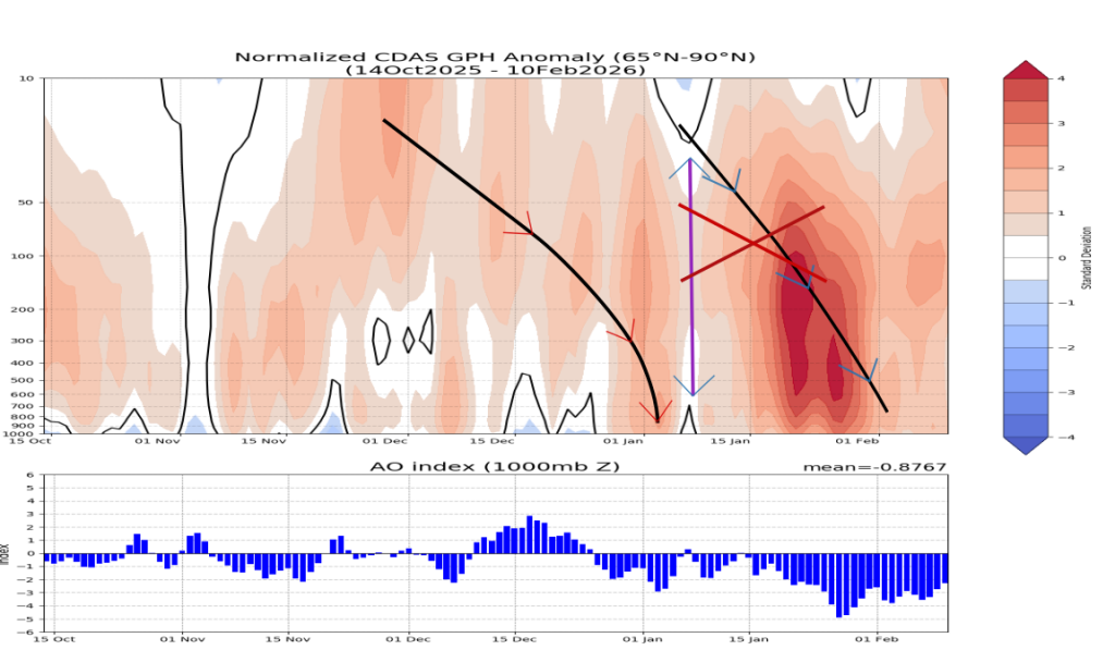 Echter, de stratosferische kaartjes zijn op verschillende manieren te interpreteren. Kun je oorzaak en gevolg dan niet omdraaien? Het was de troposfeer die in december de major warming warming deed stoppen. Daarvoor heb je dan de hoogte-tijdsregistratie. Maar die kun je ook verschillend interpreteren.