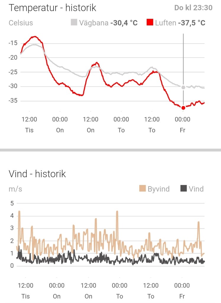 Vannacht is de koudste nacht van deze februarimaand tot nu toe met een minimumtemperatuur van -37,5°C. Het had nog kouder kunnen worden maar de wind nam later in de nacht wat toe waardoor het minder goed kon afkoelen (zie windgrafiek).