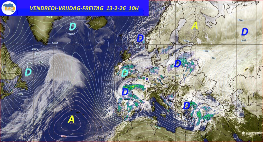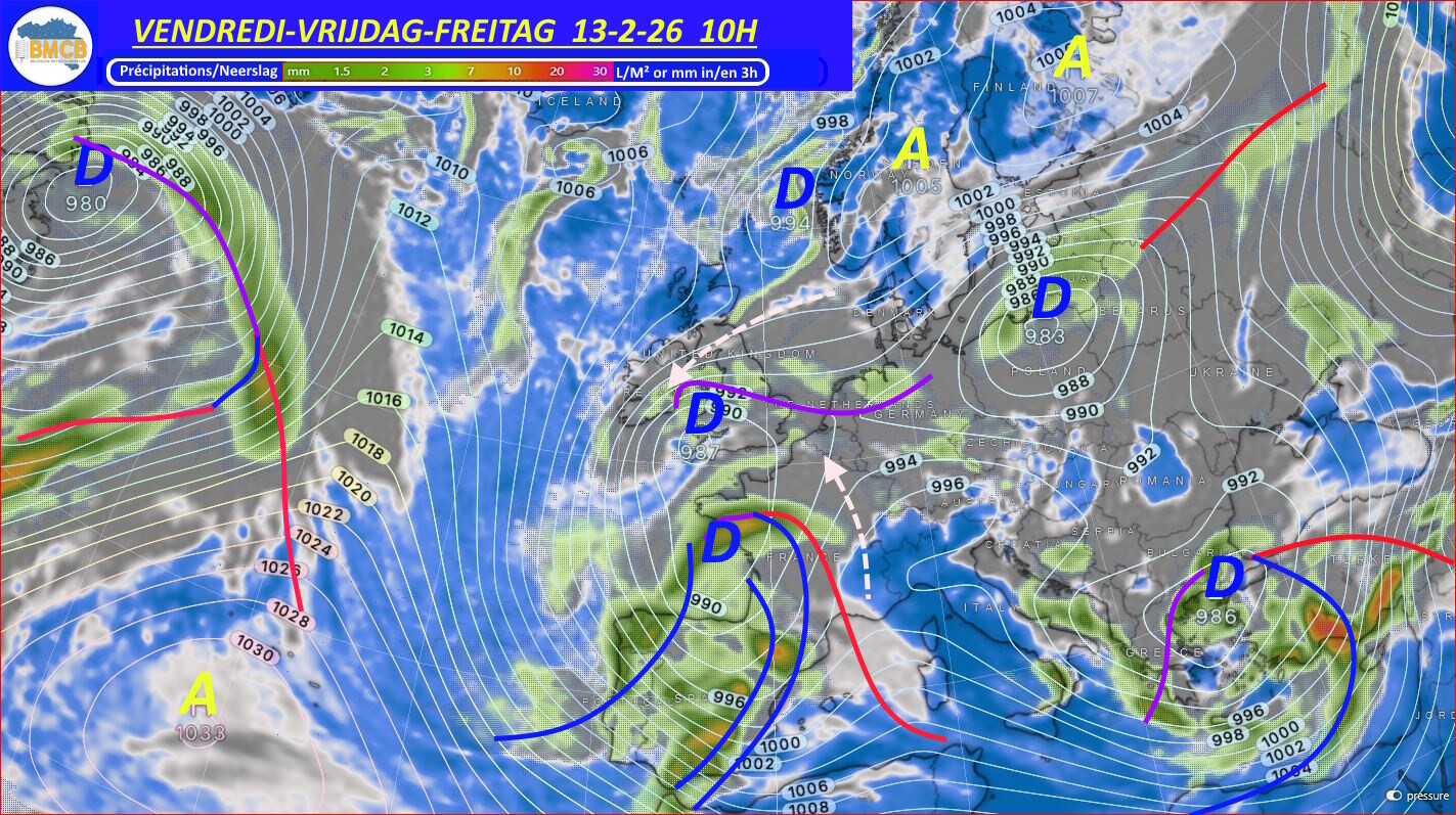 Dit systeem hangt samen met een nieuwe depressie (991 hPa) die zich maandag boven de Noordzee positioneert. Zij zal vervolgens minder koude maar onstabiele oceaanlucht naar onze regio aanvoeren, met soms intensieve buien.