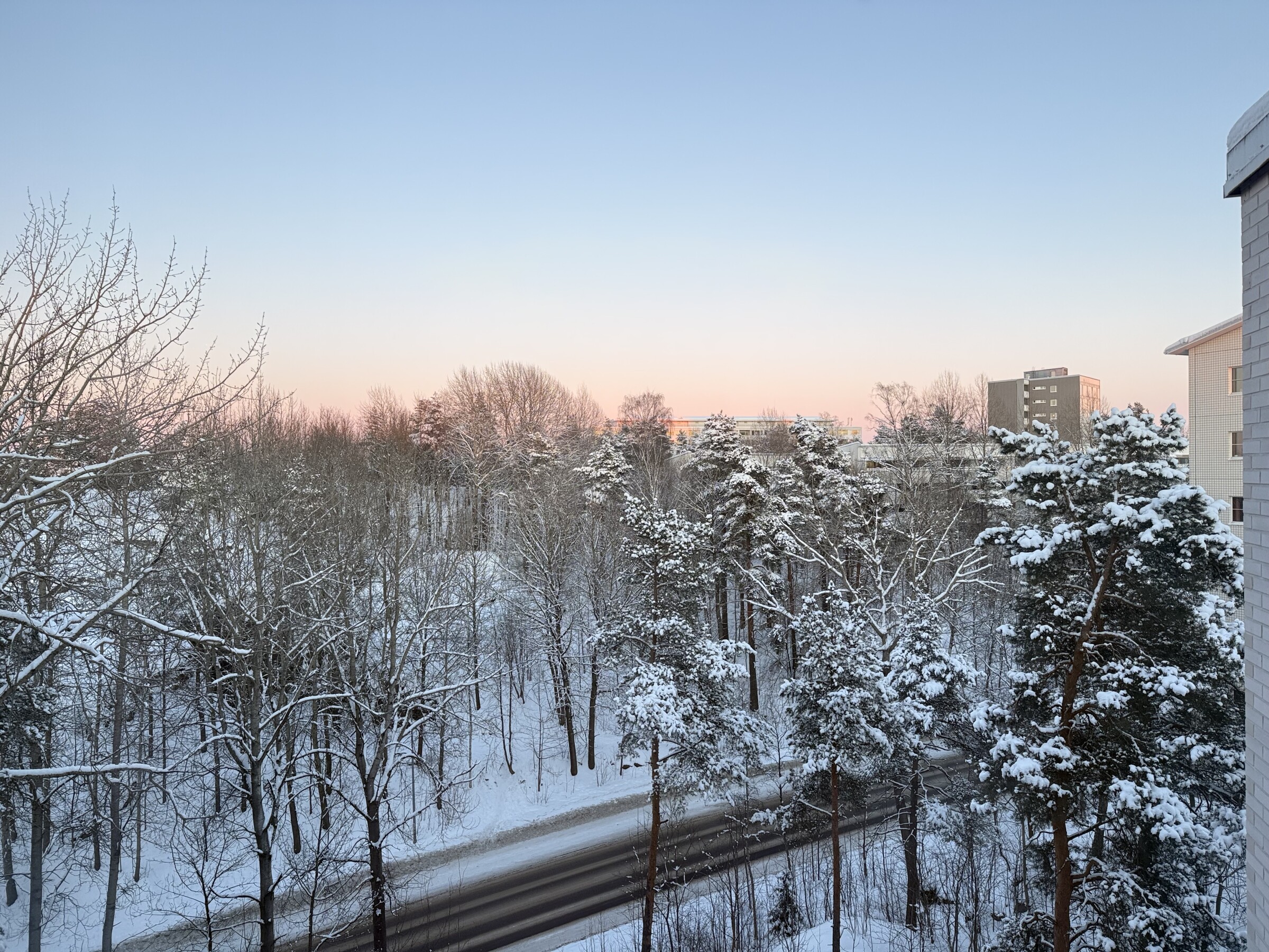 Op dit moment een paarse lucht bij zonsondergang na een zonovergoten dag. Dan weet je dat het een koude nacht gaat worden, zeker boven het dikke sneeuwdek