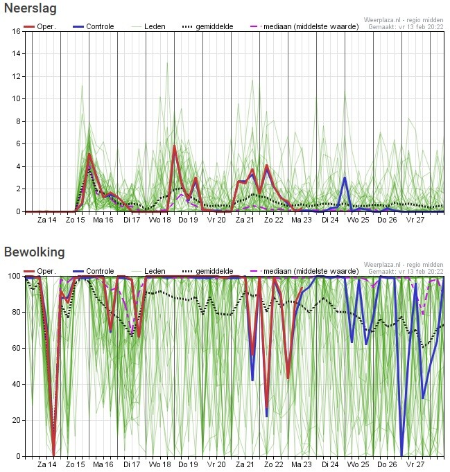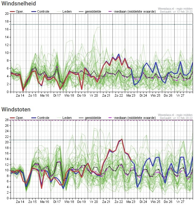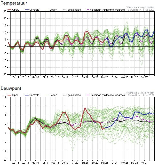 De onzekerheid is goed af te leiden uit de temperatuurpluim, maar ook uit de windrichtingen pluim.