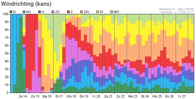 De wind lijkt rond het midden van de week toch meer een richting tussen zuid en oost op te zoeken.