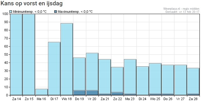 De komende dagen is het vrij koud weer met vorst in de nachten. Vrij zeker is wel dat vanaf maandag de temperaturen wat oplopen, maar vanaf komende woensdag kan het alle kanten op met de temperatuur. Een aantal leden gaat dan zelfs voor lichte tot matige vorst in de nachten.