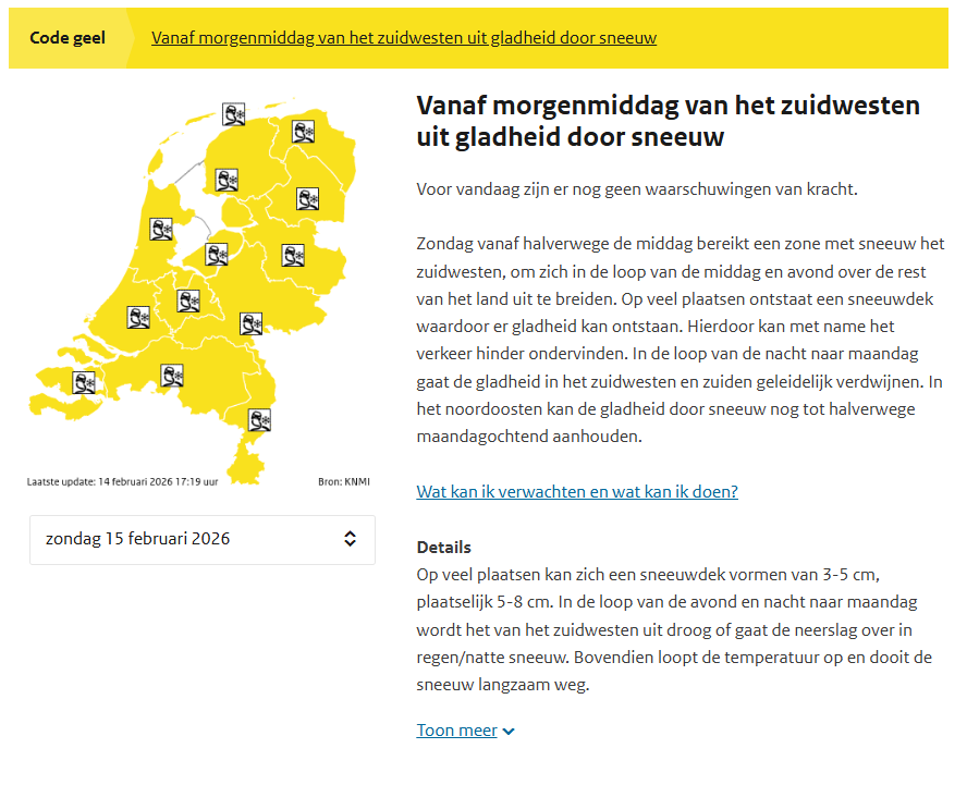 Landelijke code geel voor 3-8 cm sneeuw op zondag en maandag.