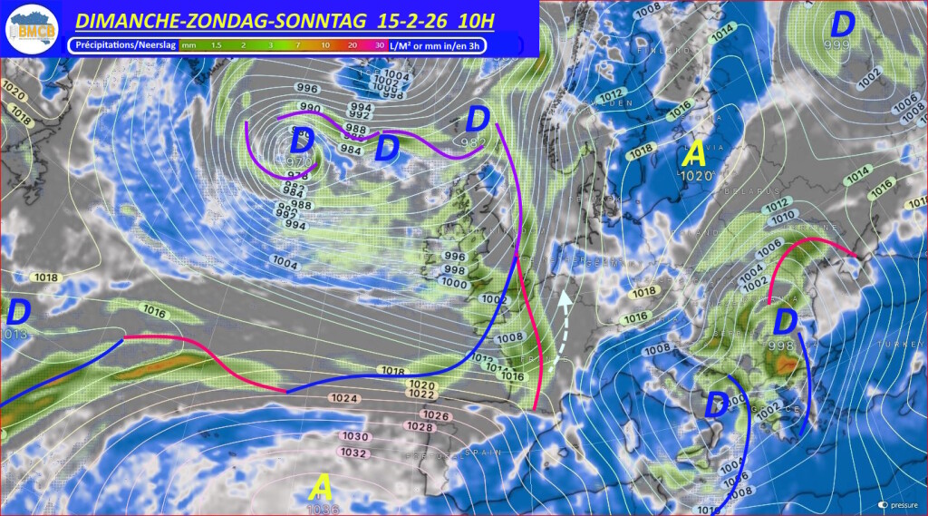 Dit hogedrukgebied duwt de volgende depressiezone (995 tot 985 hPa), die woensdag ten westen van Ierland en de Golf van Biskaje wordt verwacht, zuidwaarts richting Frankrijk en vervolgens naar Noord-Italië, waar zij donderdag een kerndruk rond 998 hPa zal hebben.