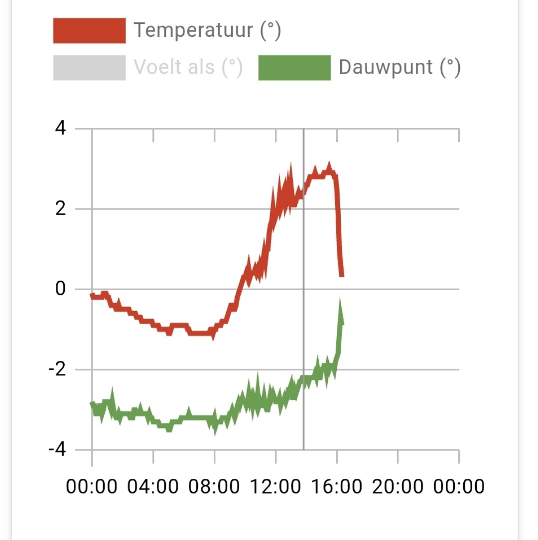 Van 3,0°C naar bijna 0°C in amper 20 minuten. Die polair continentale lucht helpt goed en ook de omgeving is koud genoeg na een nacht vorst.