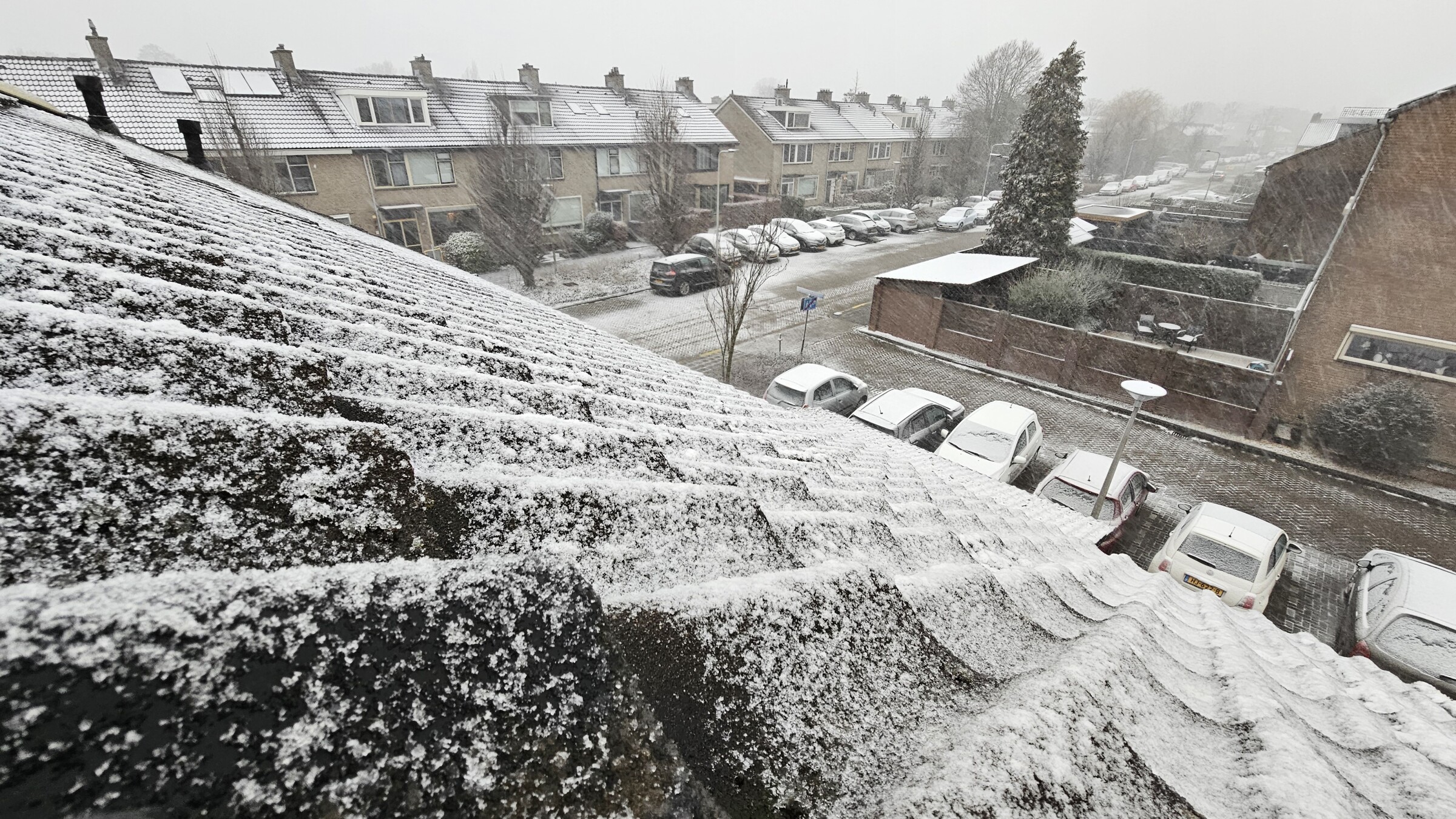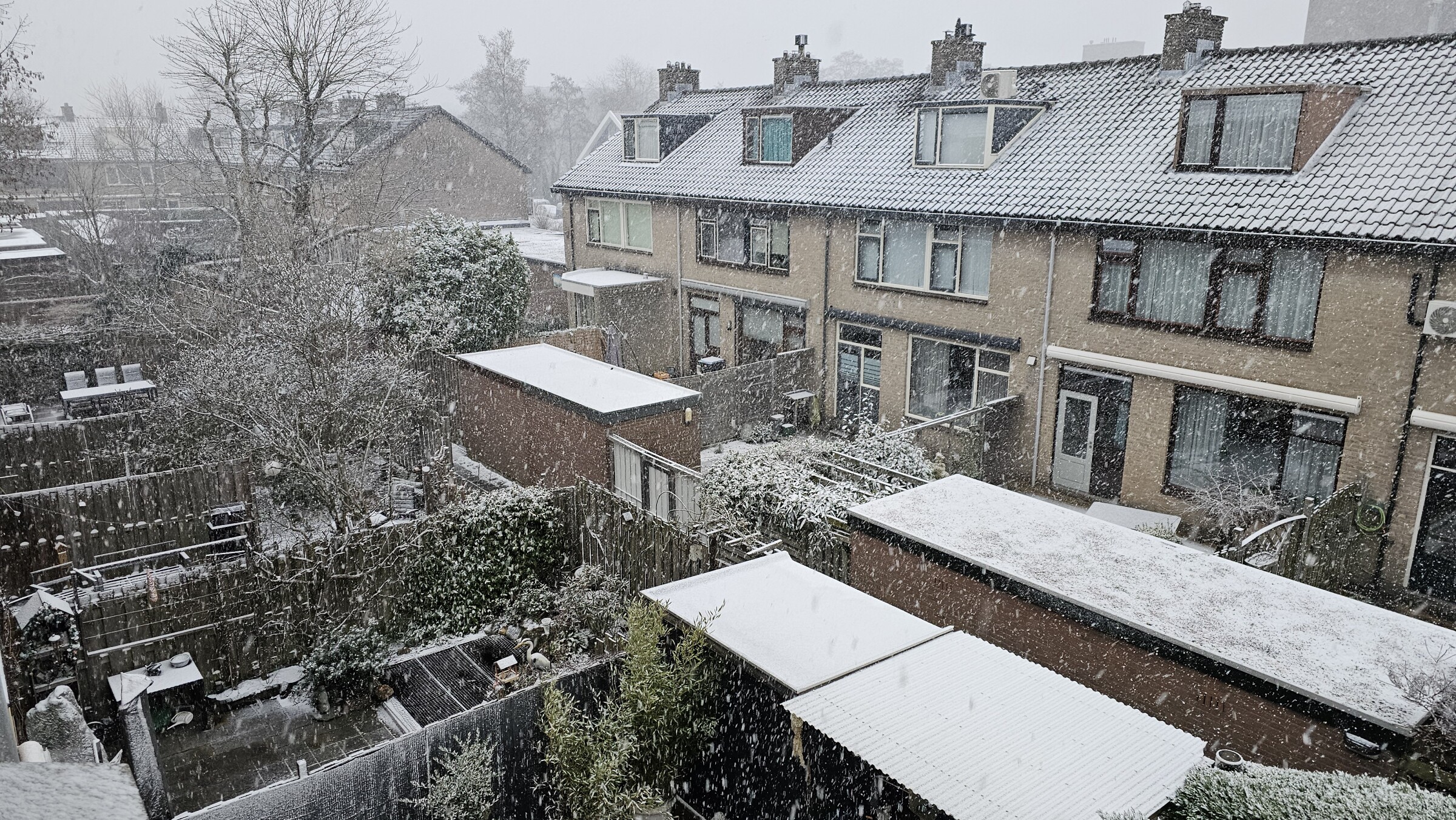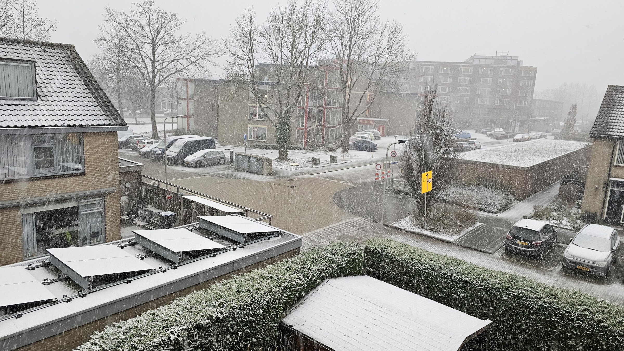 Sinds 10 minuten sneeuw. Matig. Tact 2,2 graden.