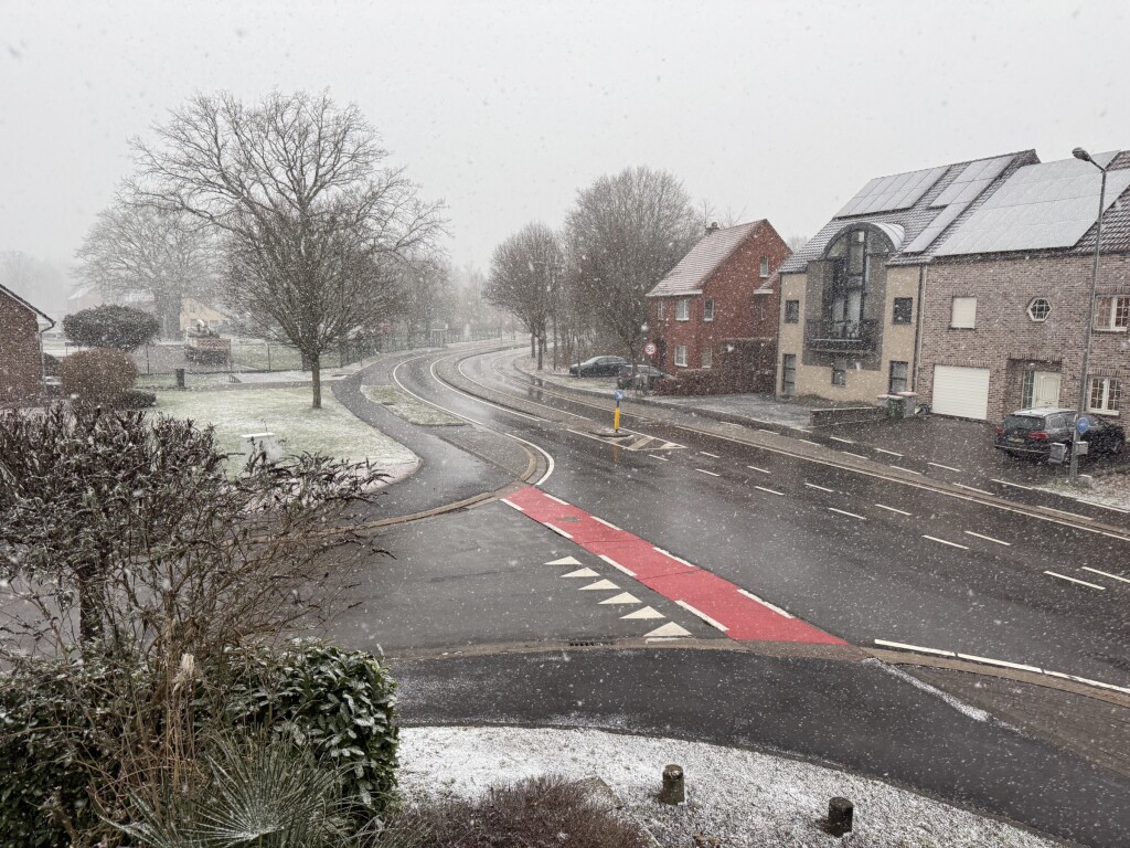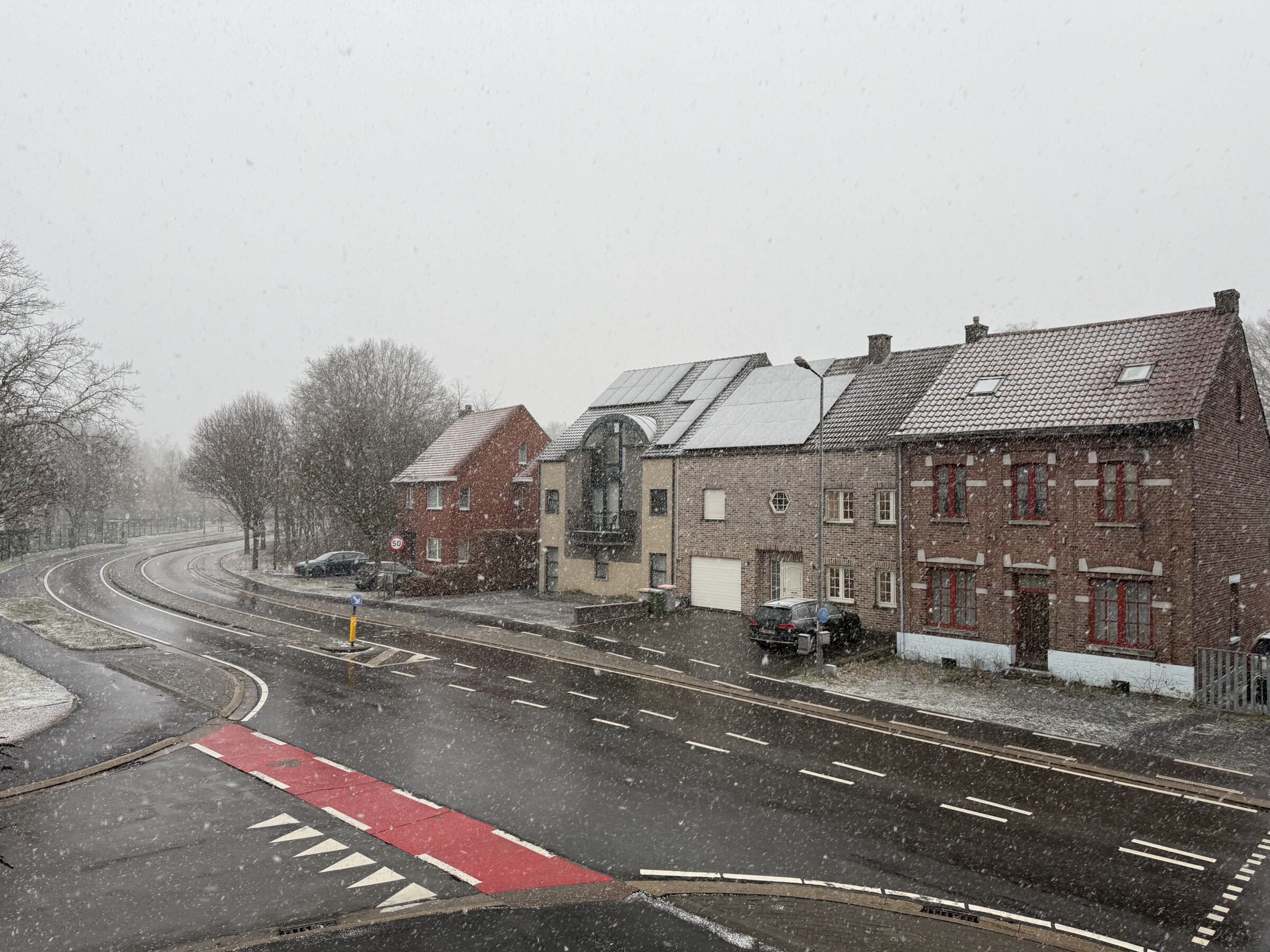 Sinds 10 minuten sneeuw. Matig. Tact 2,2 graden.