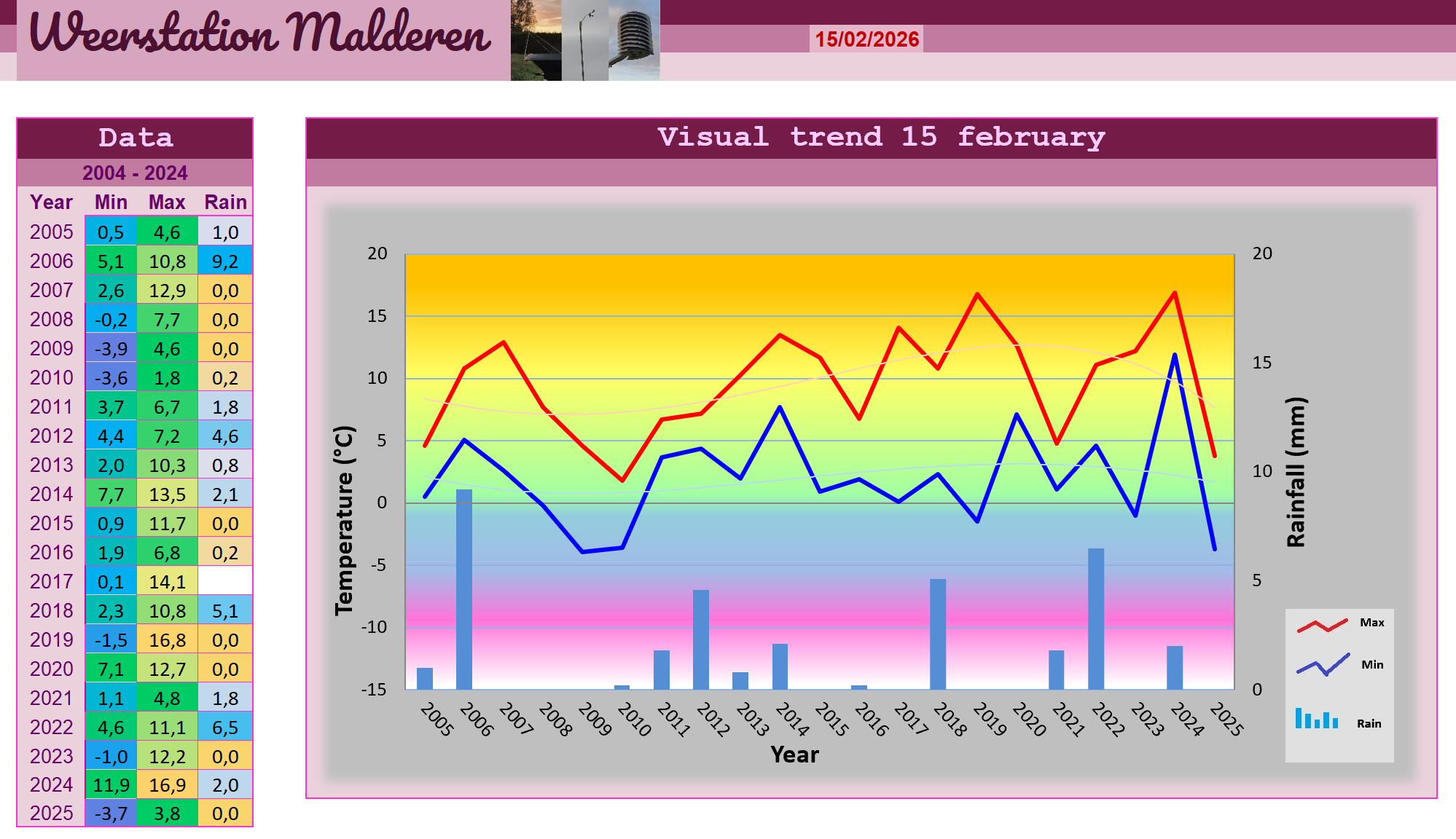 Een welgekomen afwisseling op het eerder sombere thema van wolken en regen dat zich de voorbije dagen en weken afspeelde, was het vanmorgen toen het helemaal helder was en een reeds aardig aan kracht winnende februarizon aan de hemel stond te blinken. Deze opklaringen (nou ja, er was maar één opklaring zij het dan een hele grote) zorgden er echter voor dat het tijdens de ochtenduurtjes behoorlijk is afgekoeld. De minima bedroegen 2,6 graden in de hut en op sommige plaatsen moest er zelfs flink gekrabd worden. Diepe oceaandepressies ten westen van ons brachten een aanvoer van subtropische lucht op gang waardoor de temperatuur, mede geholpen door de eerdergenoemde zon, flink de hoogte werd ingejaagd en we aldus maxima van 12,9 graden konden noteren. De oceaandepressies zijn in de loop van de dag wat dichterbij gekropen waardoor we in het westen geleidelijk wat Cirrusbewolking zagen verschijnen die zich vervolgens over het volledige Malderse luchtruim ging verspreiden. Voor de zon was dit echter nauwelijks hinderlijk en er bleven nog veel staalblauwe stukken over. Later op de namiddag en in de loop van de avond ging deze bewolking zelfs in ons voordeel spelen door ons eerst op een schitterend gekleurde zonsondergang te trakteren en vervolgens de avondlijke afkoeling af te remmen waardoor de kansen op vorst komende nacht minder groot zijn dan vanochtend. Bij dit alles is de wind gedraaid naar het zuidwesten en ze haalde maximaal 25,7 km/h. Neerslag is er natuurlijk niet gevallen vandaag.