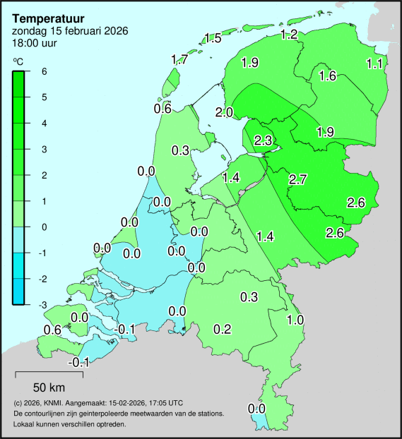 Opmerkelijk klein temperatuurverschil in het gebied waar de sneeuw nu valt.