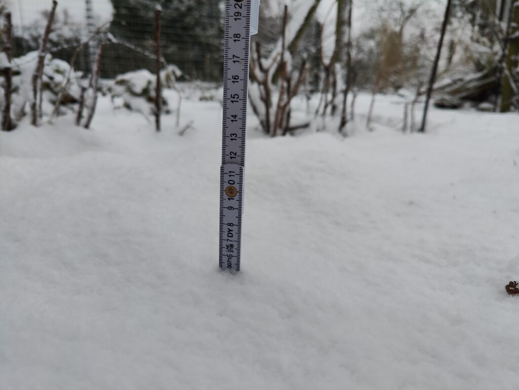 4 cm op de stoep, 6 cm gras. Sneeuwt nog lichtjes.