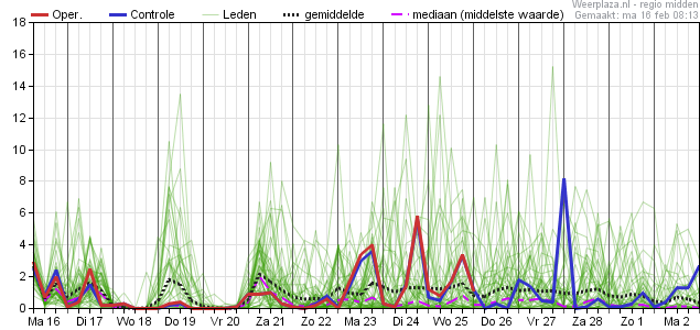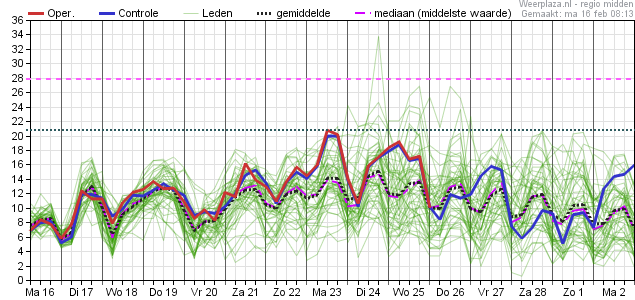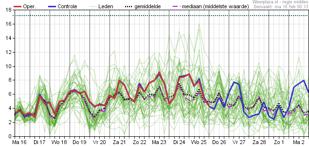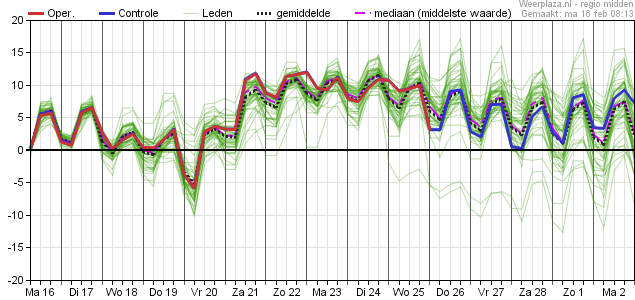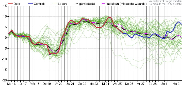 Vanaf zaterdag zoekt deze de zuidwesthoek weer op lijkt daar tot het einde van de periode te blijven, al moet daar bij gezegd worden dat er vanaf 27 februari behoorlijke spreiding is te zien, wat aan geeft dat er ook andere opties mogelijk zijn.