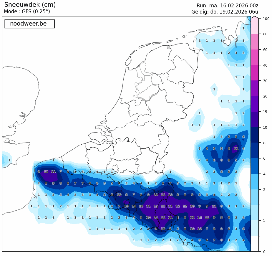 Een winterse neerslagzone stagneert over het noorden van Frankrijk en kan nog wat schuiven. Wie weet een nieuwe winterprik!