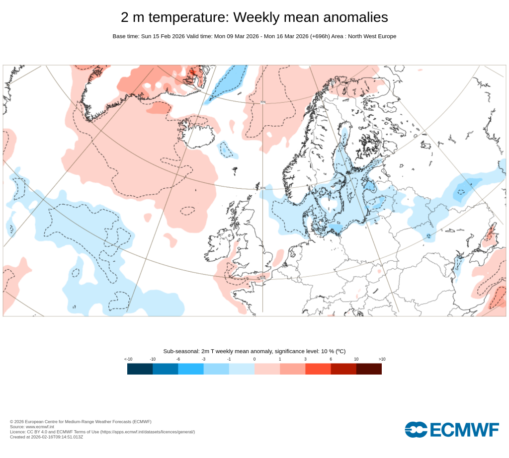 Moeten lopen. Het continent is goed afgekoeld, kou is vaak dichtbij en het draait vaak in maart uit op NW/N/NO stromingen en daarom ook de maartse buien. Als dat zo komt, dan komt daar dit jaar nog minder warmte vandaag dan andere jaren. Ik zie het niet gebeuren. Ook de warmte vanaf de 21ste kan zomaar kouder worden als de rugopwerping toch wat meer NO aanpunt. Er ligt namelijk net ten oosten van ons -10 en lager klaar op het 850 drukvlak. We zijn het niet meer gewend maar overal om ons heen is temperatuur onderdrukking aanwezig. Zie bijgevoegde kaart bijv; een prachtige uitwerking van een koudere Oostzee. Als maart wat een zeer milde wordt, dan vind ik dat een enorme Houdini act!