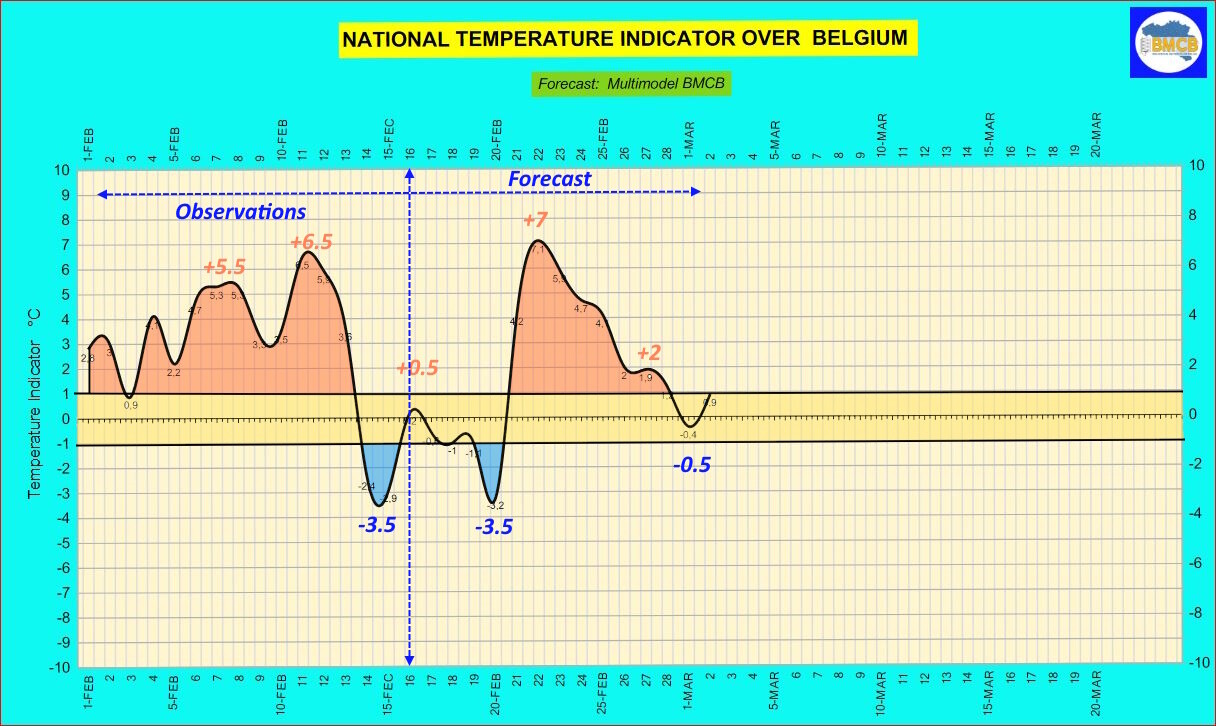 De Belgische nationale thermische indicator zal de komende dagen opnieuw dalen en rond vrijdag 20 februari een minimum bereiken tussen -3 en -4. Deze koudere fase gaat gepaard met maximumtemperaturen tussen 0 en 6°C en minima tussen -6 en 0°C.