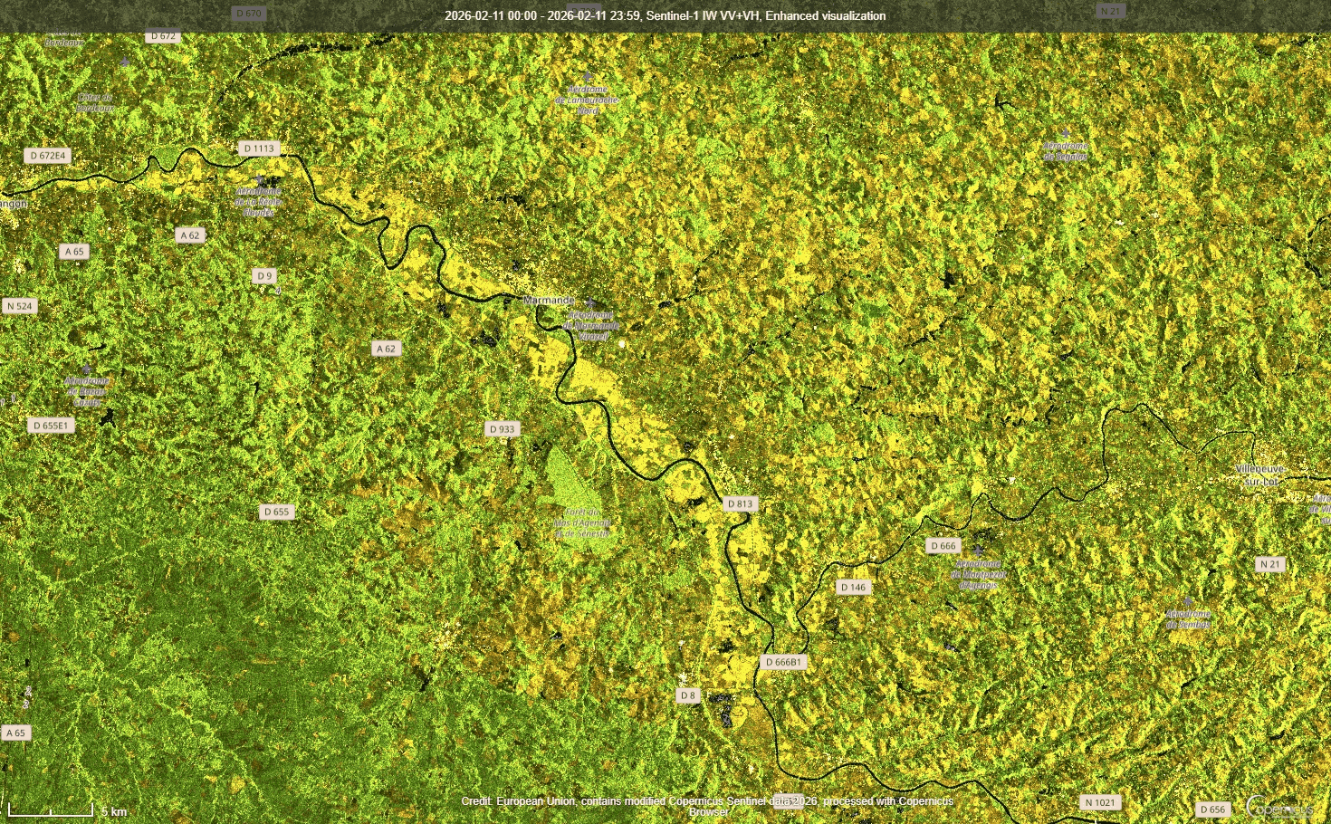 De Sentinel-satelliet brengt de overstromingen van de Garonne-rivier (ten zuidoosten van Bordeaux) goed in beeld. Op sommige plekken is de riviervlakte een ruime 4 kilometer breed, waarvoor al dagenlang code rood uitstaat. Het einde is nog niet in zicht: ook vandaag valt er in het stroomgebied van de Garonne weer een bak water. De Fransen, maar ook de mensen op het Iberisch Schiereiland, zullen blij zijn als de lente definitief doorbreekt.