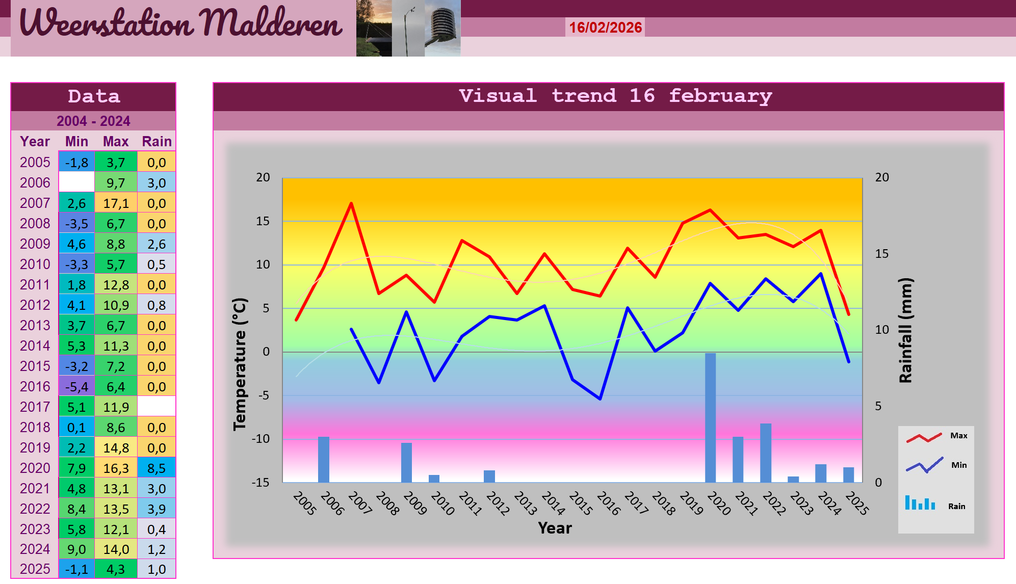 Na een zeer zachte en winderige nacht begon de dag met Altostratusbewolking en Stratocumulusvelden. De wind is naar zuid- zuidwestelijke richtingen gekrompen en tegen de middag klaarde het op vanuit het westen. De bewolking ging over in Cirrostratus en daaronder hingen zuidwest- noordwest geschikte Stratocumulusbanden net zoals we ze bij de storm vorige week ook zagen. De zon dook hier dus regelmatig achter weg maar toch bleef het zacht aanvoelen bij hoge maxima van 16,3 graden. Dan dreef er meer Stratocumulus binnen en ging de bewolking weer over in Altostratus op nadering van het koufront. Om 18H26 was het dan zover en passeerde het zeer smalle koufront Malderen met pittige stortbuien, regen die horizontaal door de straten vloog en een scherpe windruiming naar het west-noordwesten. Dit ging ook gepaard met een zeer scherpe temperatuursdaling. Het bleef vervolgens nog een tijdje naregenen maar de wind ging er ondertussen uit waardoor we weer konden herademen en de kans kregen om de tuinmeubelen weer bijeen te zoeken in naburige dorpjes. Het neerslagtotaal is op 8,5 mm uitgekomen waarbij het meeste uit de kortdurende stortbuien kwam. De minima van 7,9 graden werden nu pas bereikt.