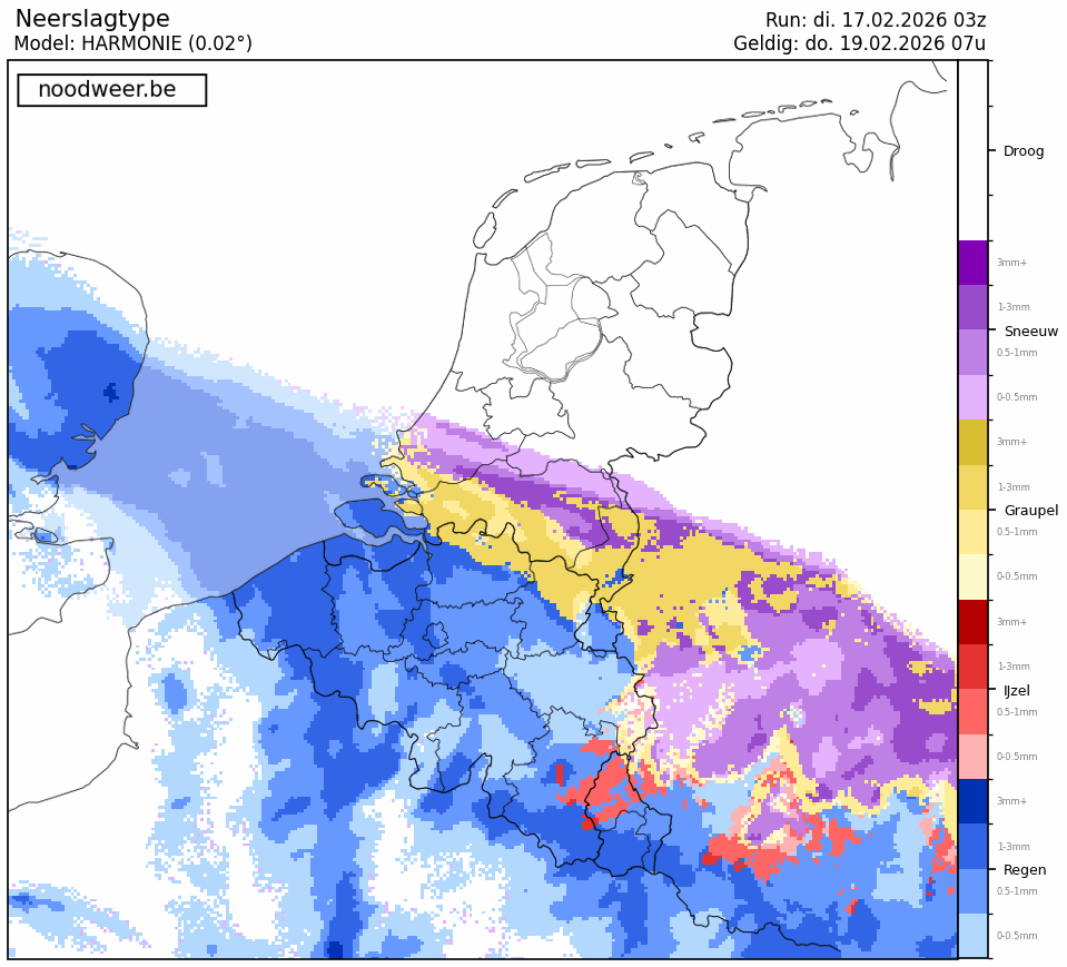 Voor de nacht van woensdag op donderdag een duidelijker verhaal met een noordelijke positie van het front en BE te veel in de warme sector. NL lijkt wel kans te maken op sneeuw.
