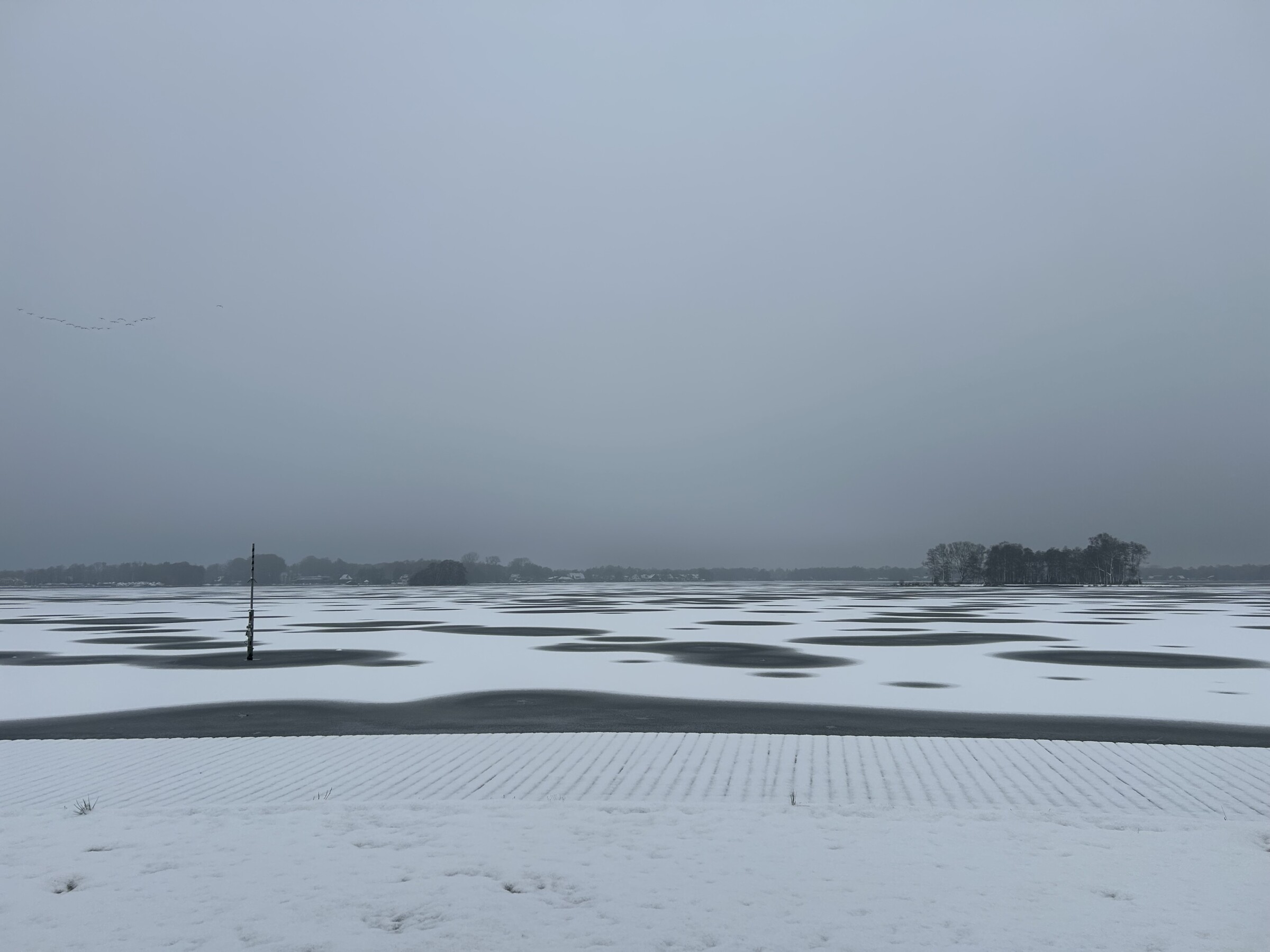 Wel of geen ijs in de ijspluim, Paterswoldsemeer ligt gewoon dicht. Foto van gisterochtend.