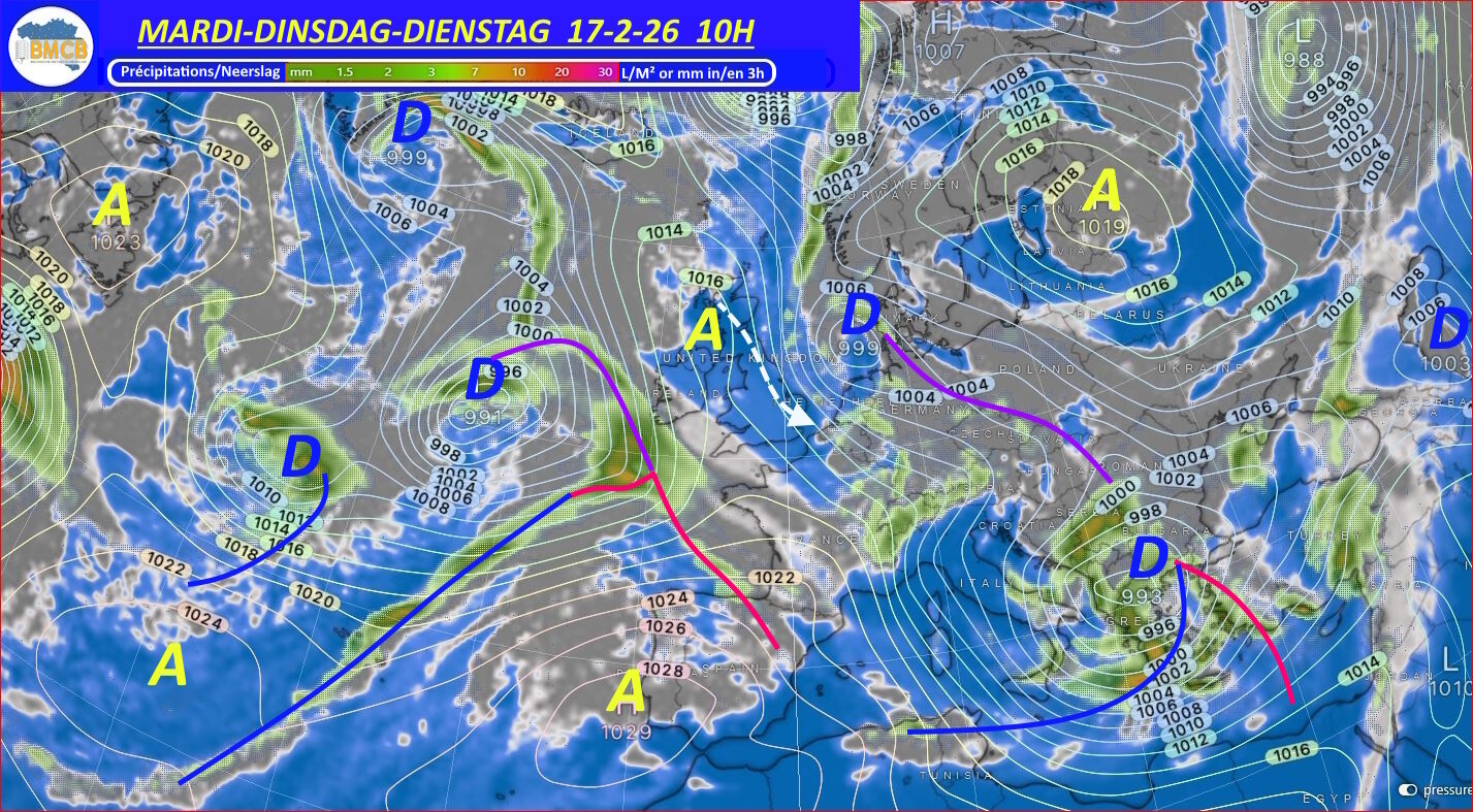 Tegelijkertijd trekt een vrij actieve depressie (991 tot 996 hPa) op woensdag en donderdag oostwaarts, van het Kanaal en Noord-Frankrijk richting de Alpen en vervolgens de Balkan. De bijbehorende neerslagzone bereikt België vanaf woensdagavond. Afhankelijk van regio en hoogte valt de neerslag als regen, smeltende sneeuw of lokaal als sneeuw.