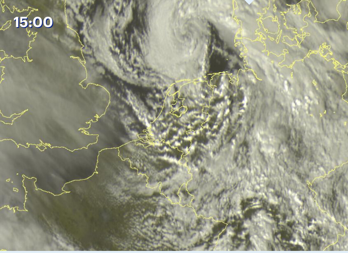Buien worden wat guurder nu. Op het satellietbeeld is goed het laagje zichtbaar die straks over de grensregio gaat trekken, waardoor we tijdelijk weer in een oostelijke stroming met koude lucht terechtkomen.