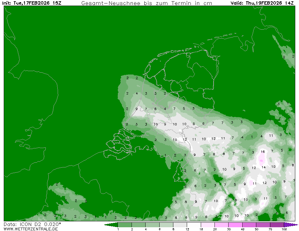Ook de jongste run van Harmonie komt met wat sneeuw over Midden-NL, maar is voor hier nog net wat te zuidelijk.