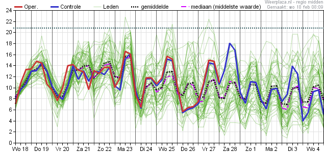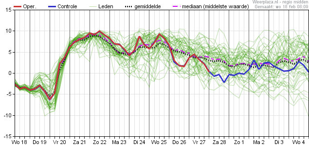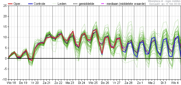 Pas op de laatste dag van deze pluim, zou de maximum temperatuur dan weer de dubbele cijfers bereiken.