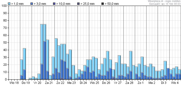 Vanaf het weekend volgt een periode met maxima in de dubbele cijfers met op zaterdag en zondag waarden rond 12 graden, op maandag rond 11 graden en dan op dinsdag en woensdag weer waarden rond de 12 graden.